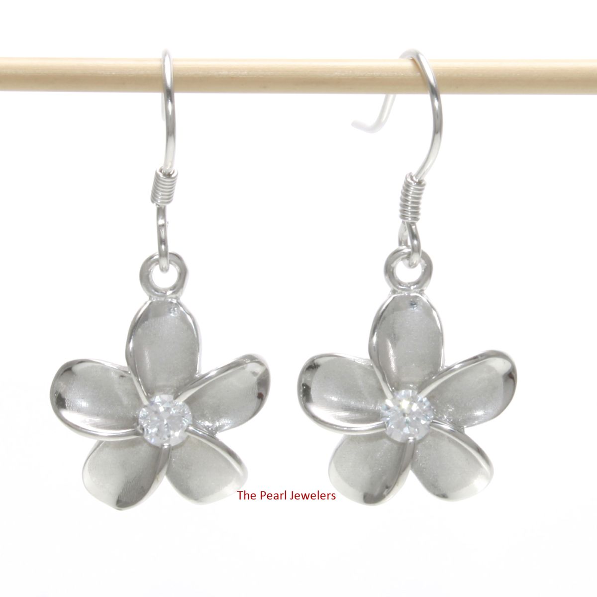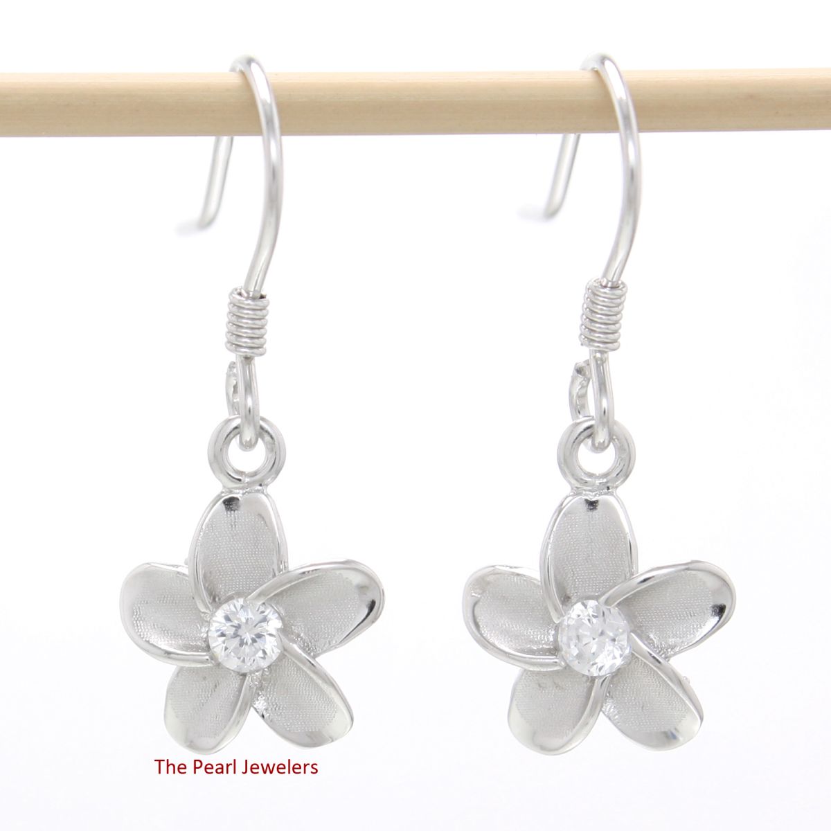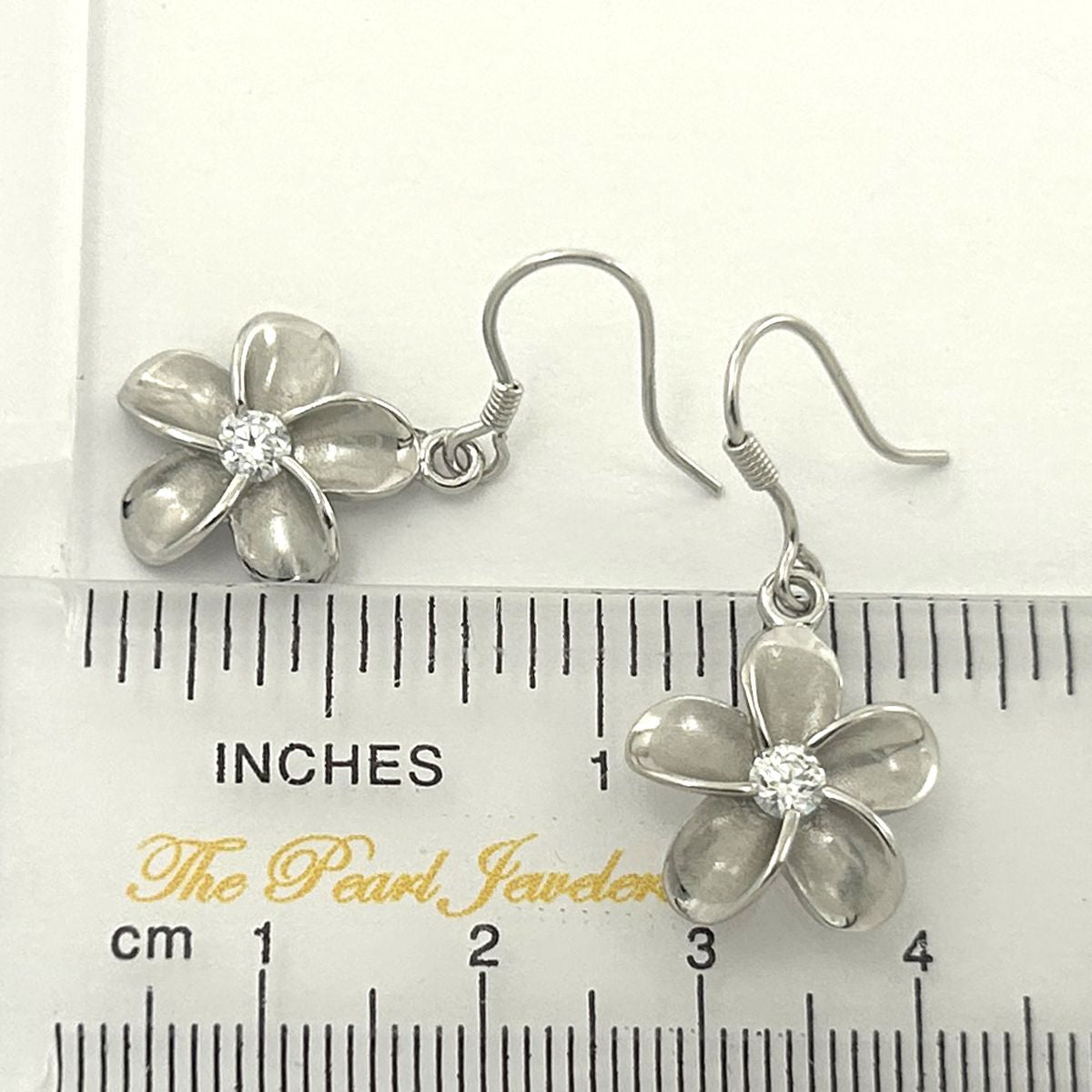 Crafted in solid .925 sterling silver with rhodium finish, these 14mm Plumeria dangle earrings feature shimmering cubic zirconia at the center for radiant shine.