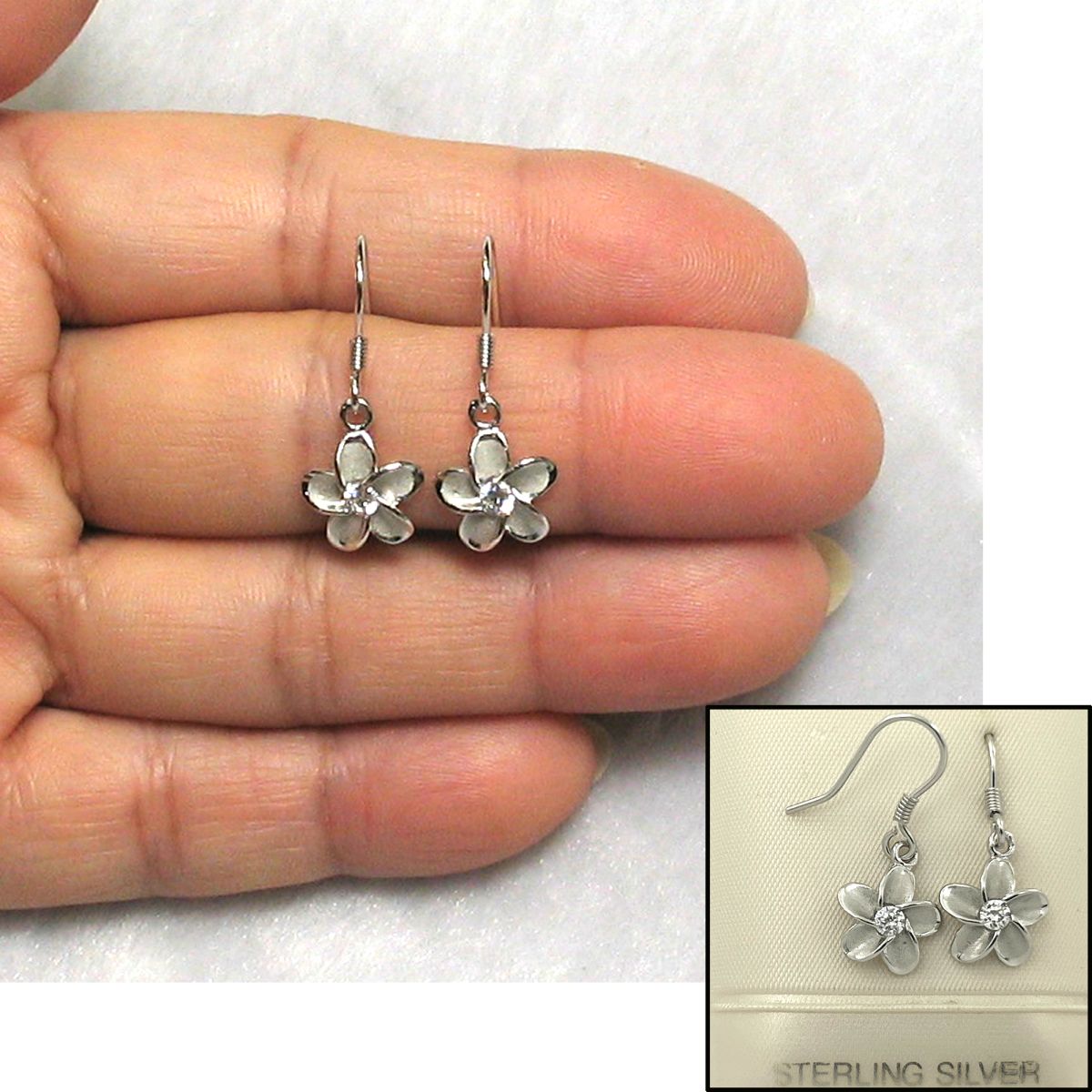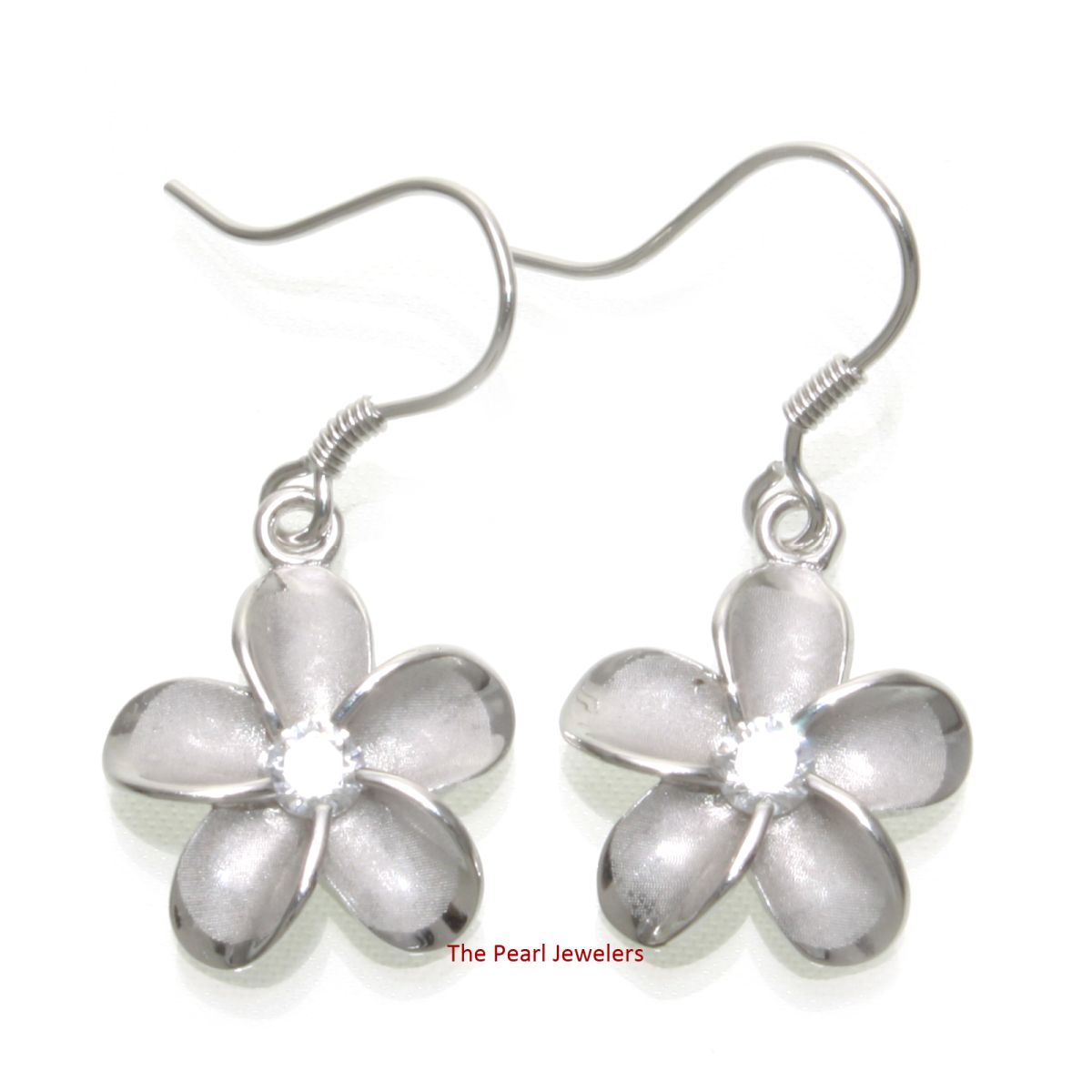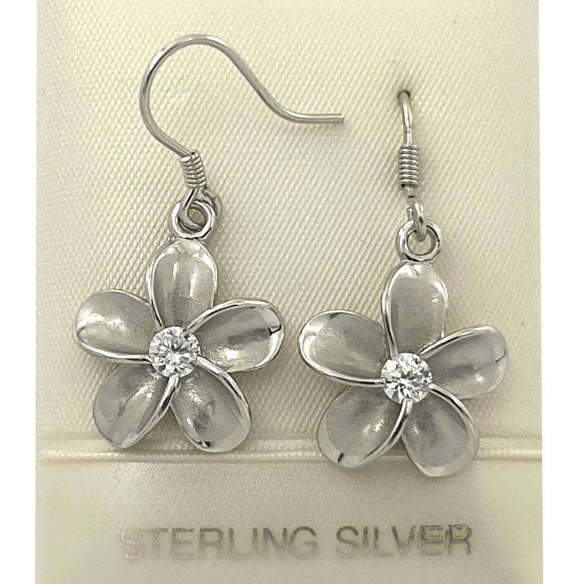 Crafted in solid .925 sterling silver with rhodium finish, these 14mm Plumeria dangle earrings feature shimmering cubic zirconia at the center for radiant shine.