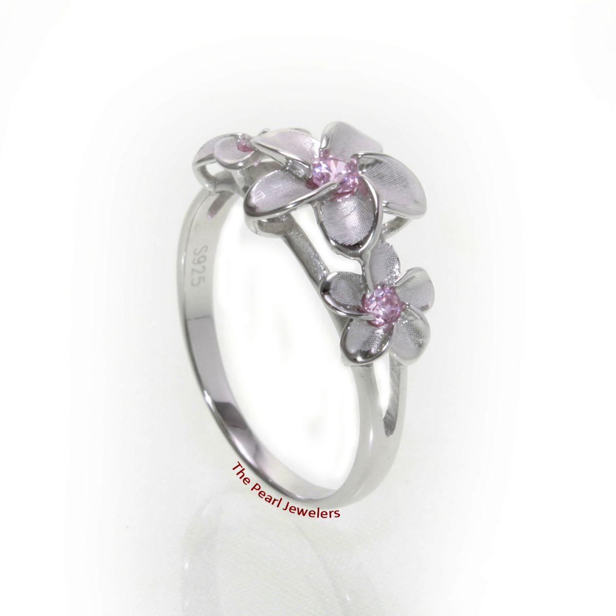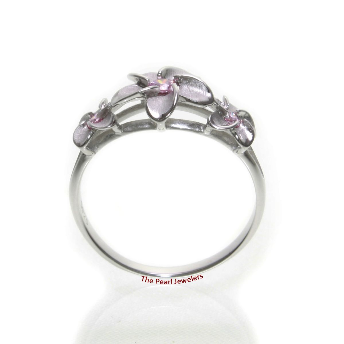 **Sterling Silver Triple Plumeria Ring with Pink Cubic Zirconia**