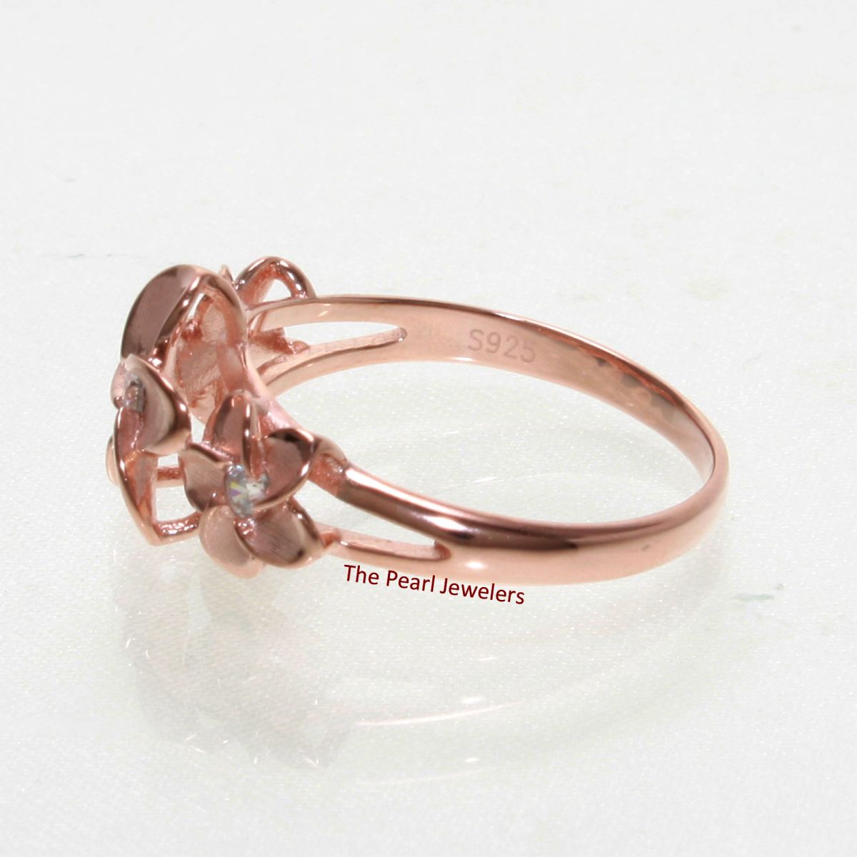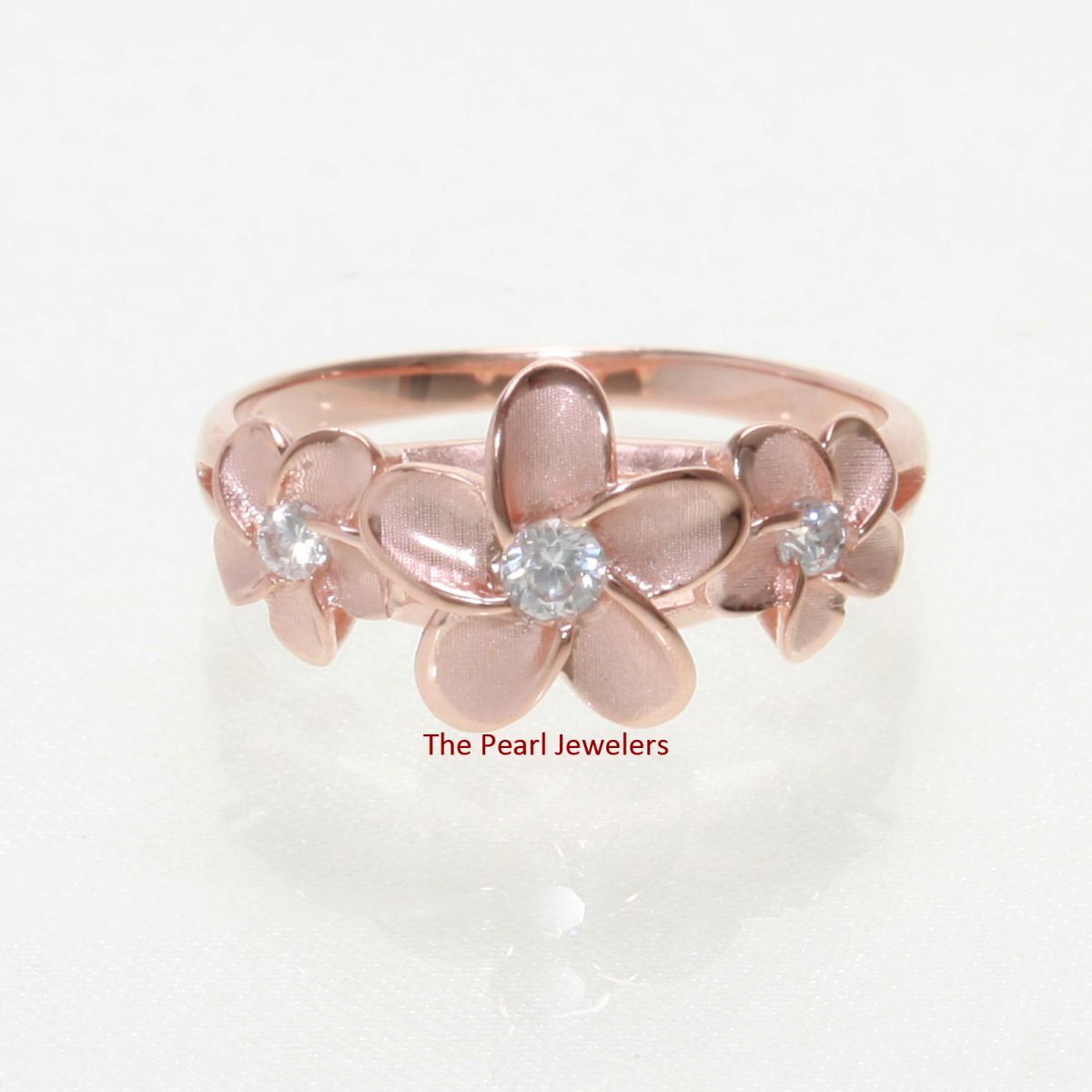 **Sterling Silver Triple Plumeria Ring with White Cubic Zirconia (Rose Gold Plated)**