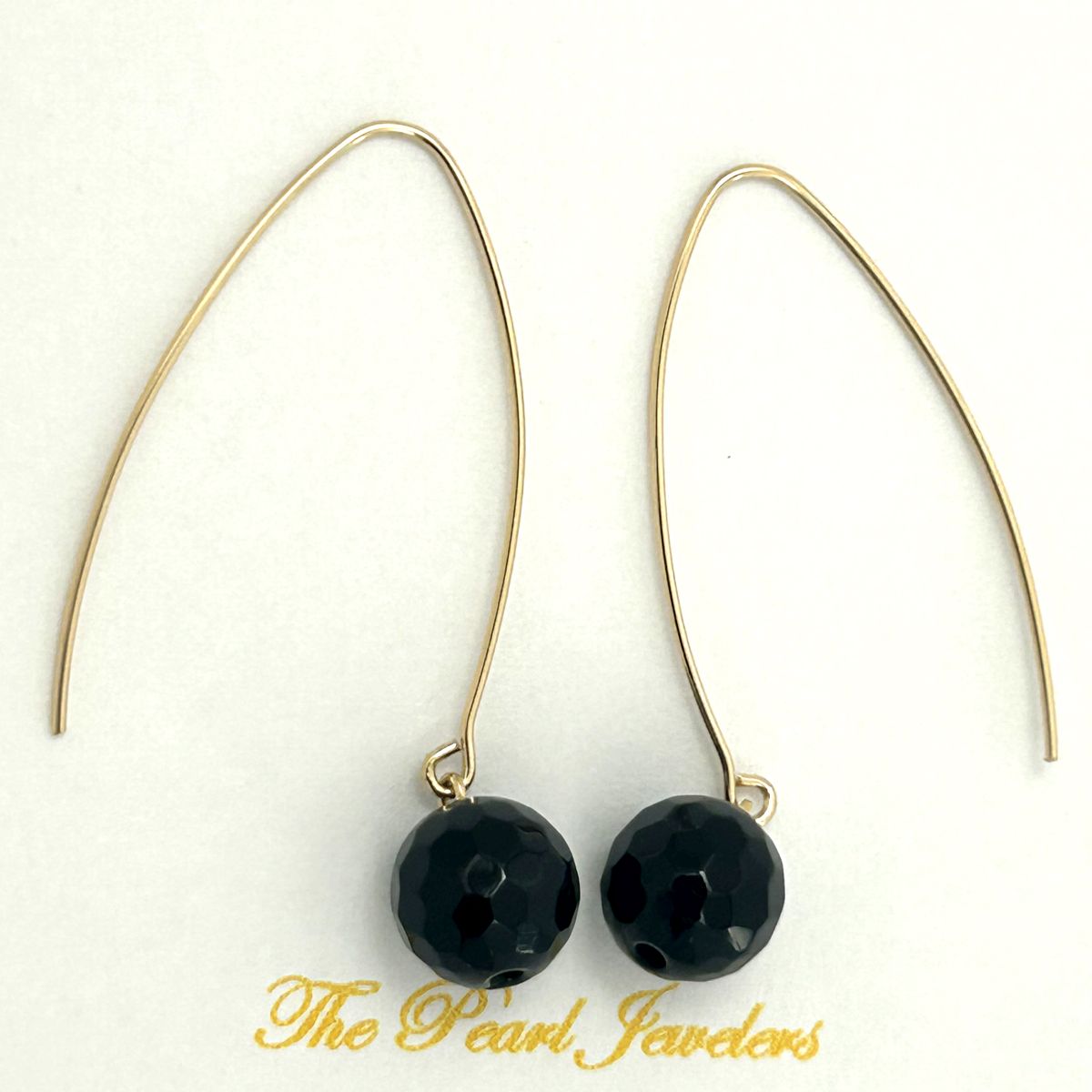 Handmade 14K gold filled V-wire earrings with faceted 8mm black onyx beads, elegant and versatile for any style.