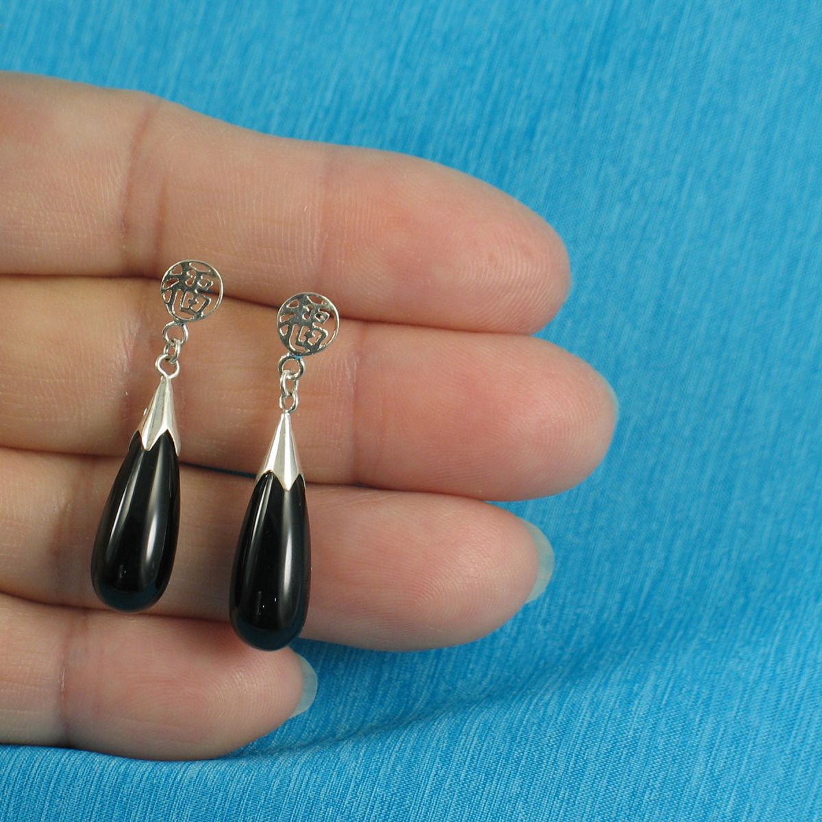 **Solid Silver 925 Oriental Good Luck Black Onyx Dangle Stud Earrings**