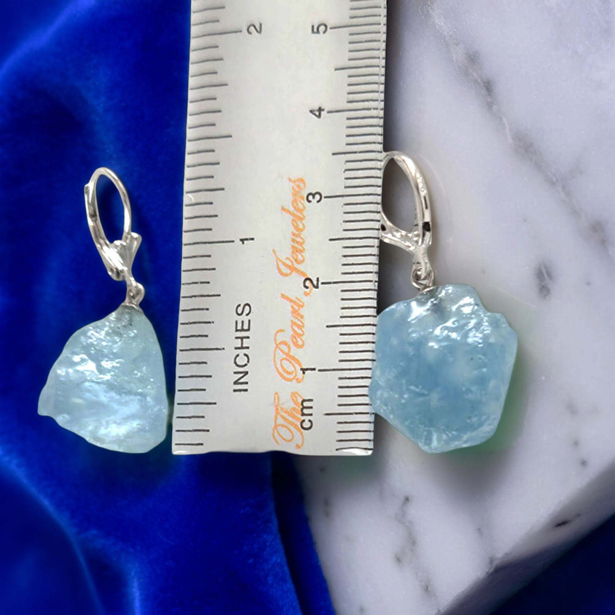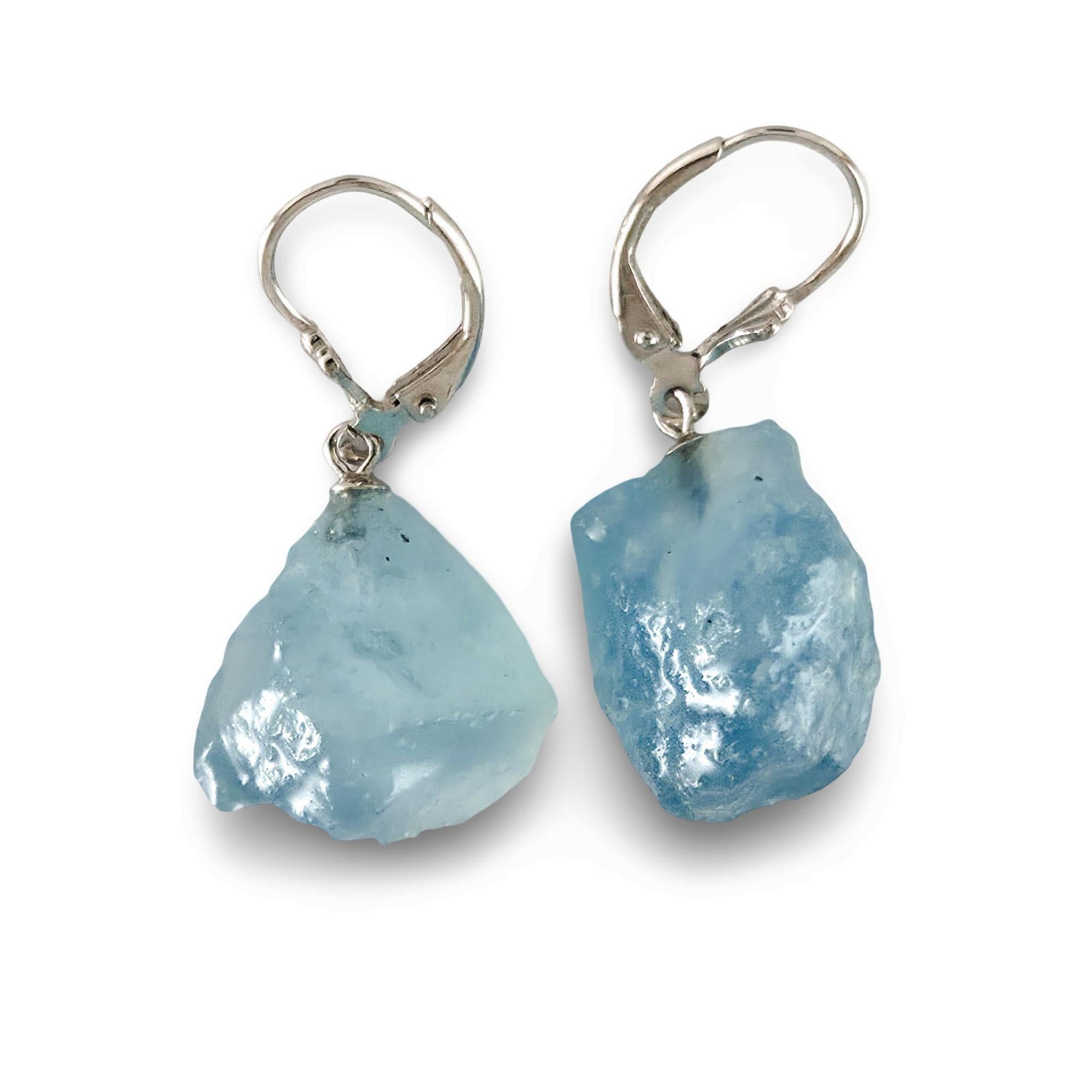 Sterling silver leverback earrings with baroque rough aquamarine stones, handmade with antique-inspired beauty. Designed for comfort and dependable daily wear.