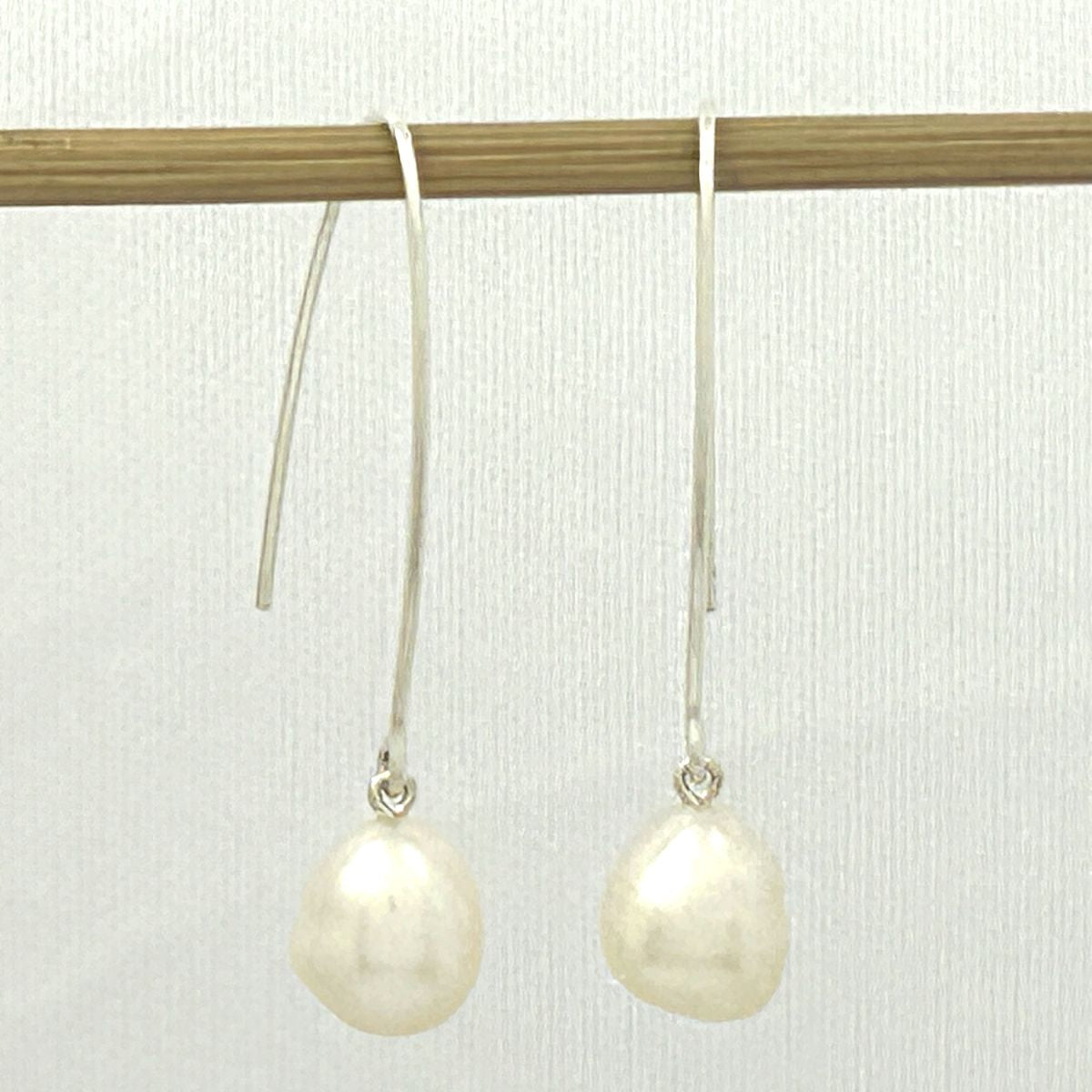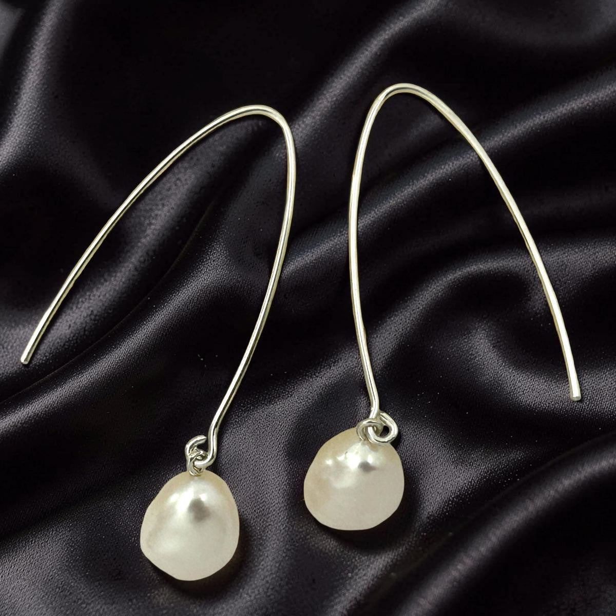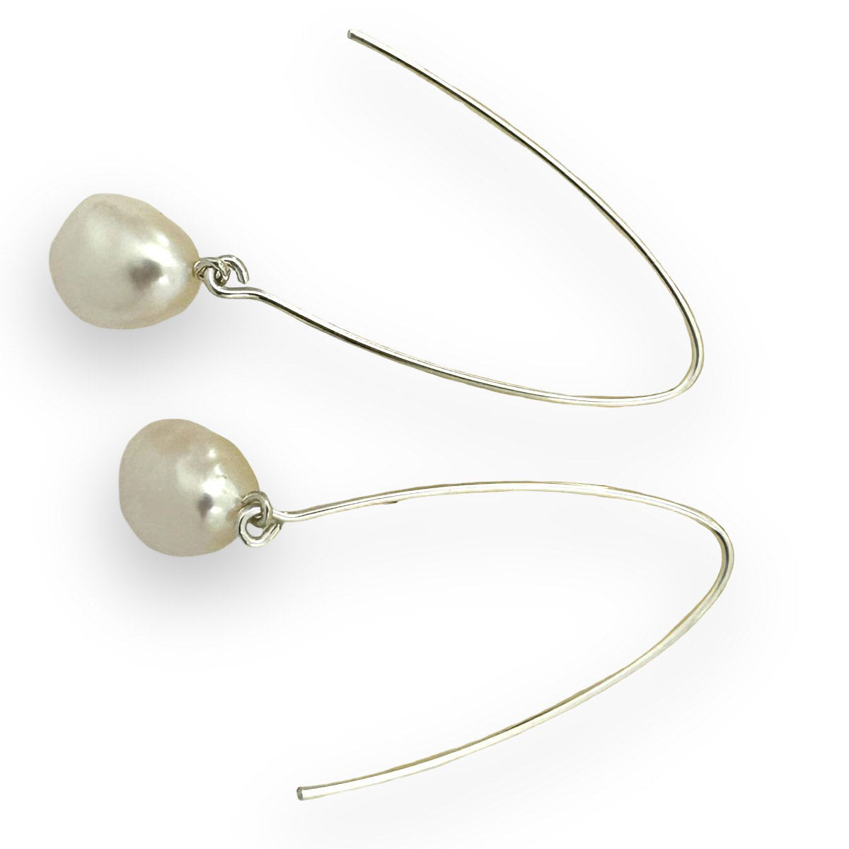 Sterling Silver V-Wire White Baroque Pearl Dangle Hook Earrings