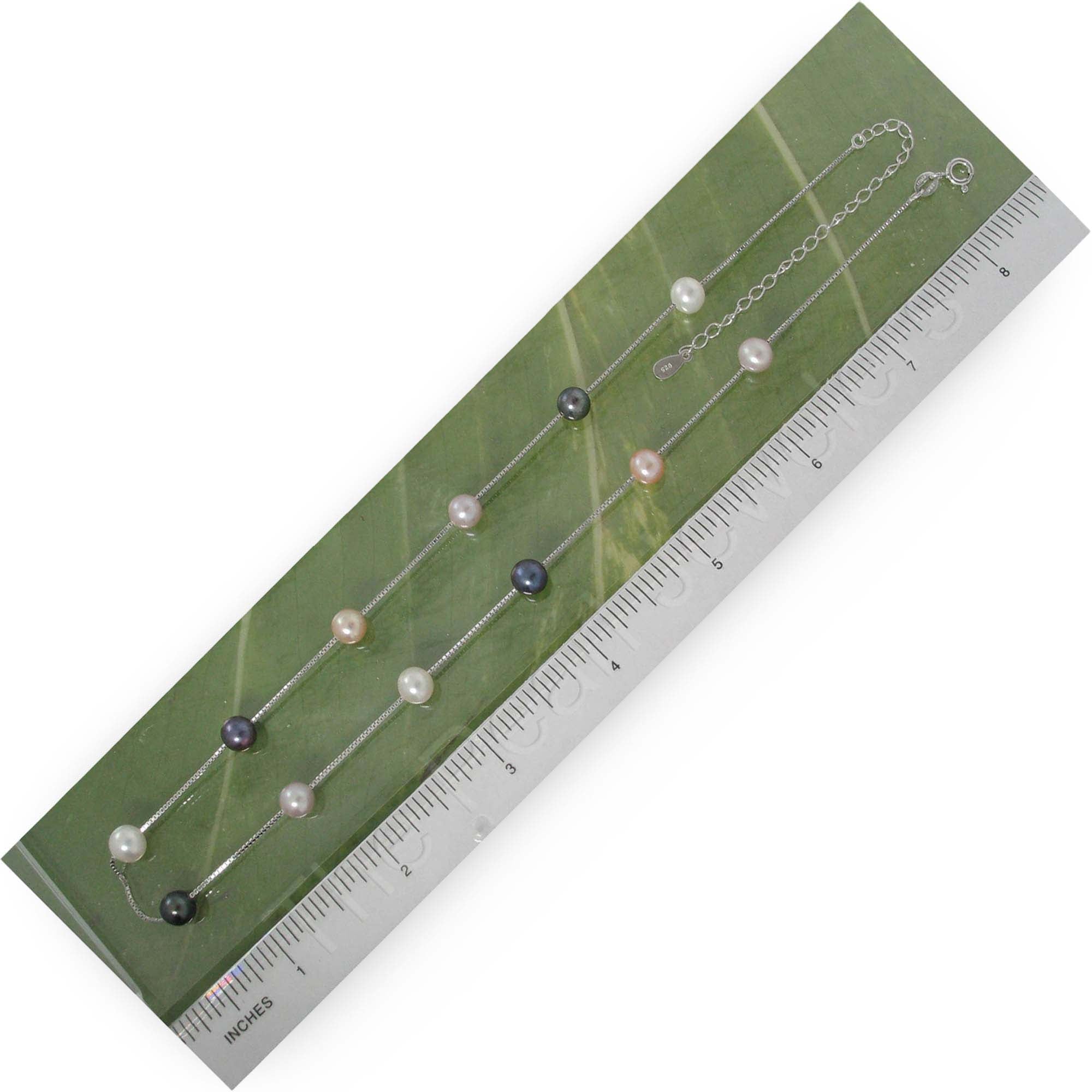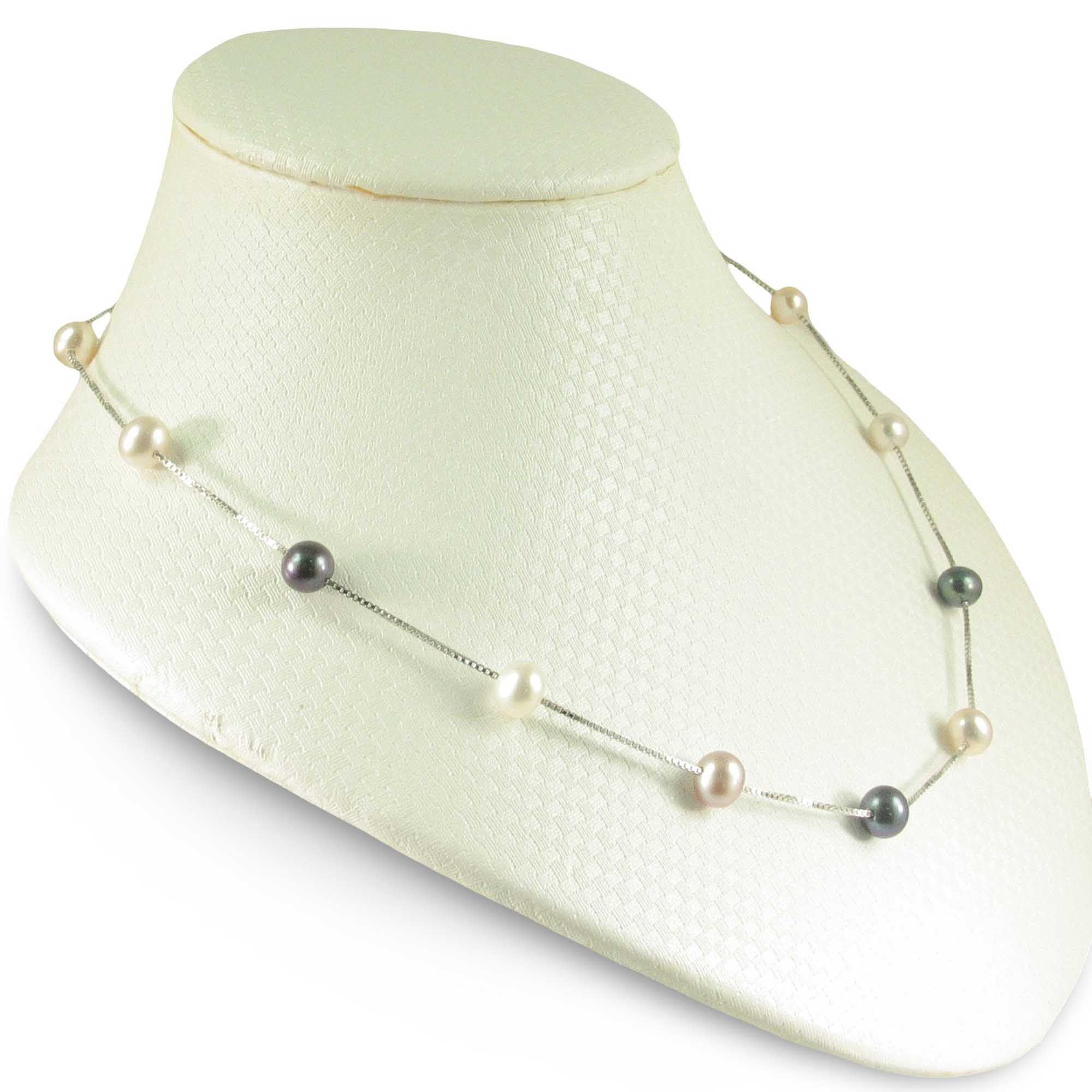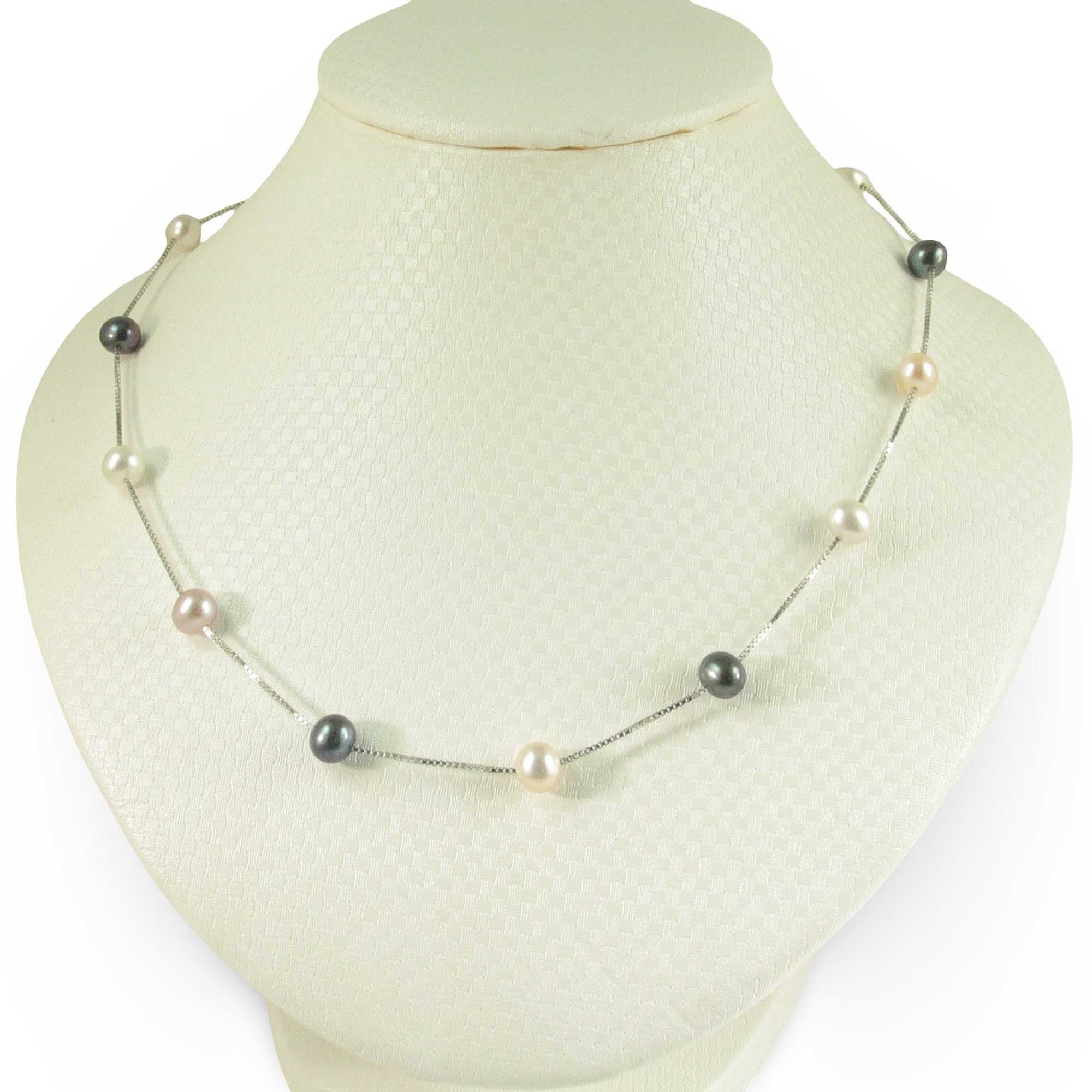 πŸ’š A tropical trio of pink, black, and white pearls glisten on a sterling silver chain.