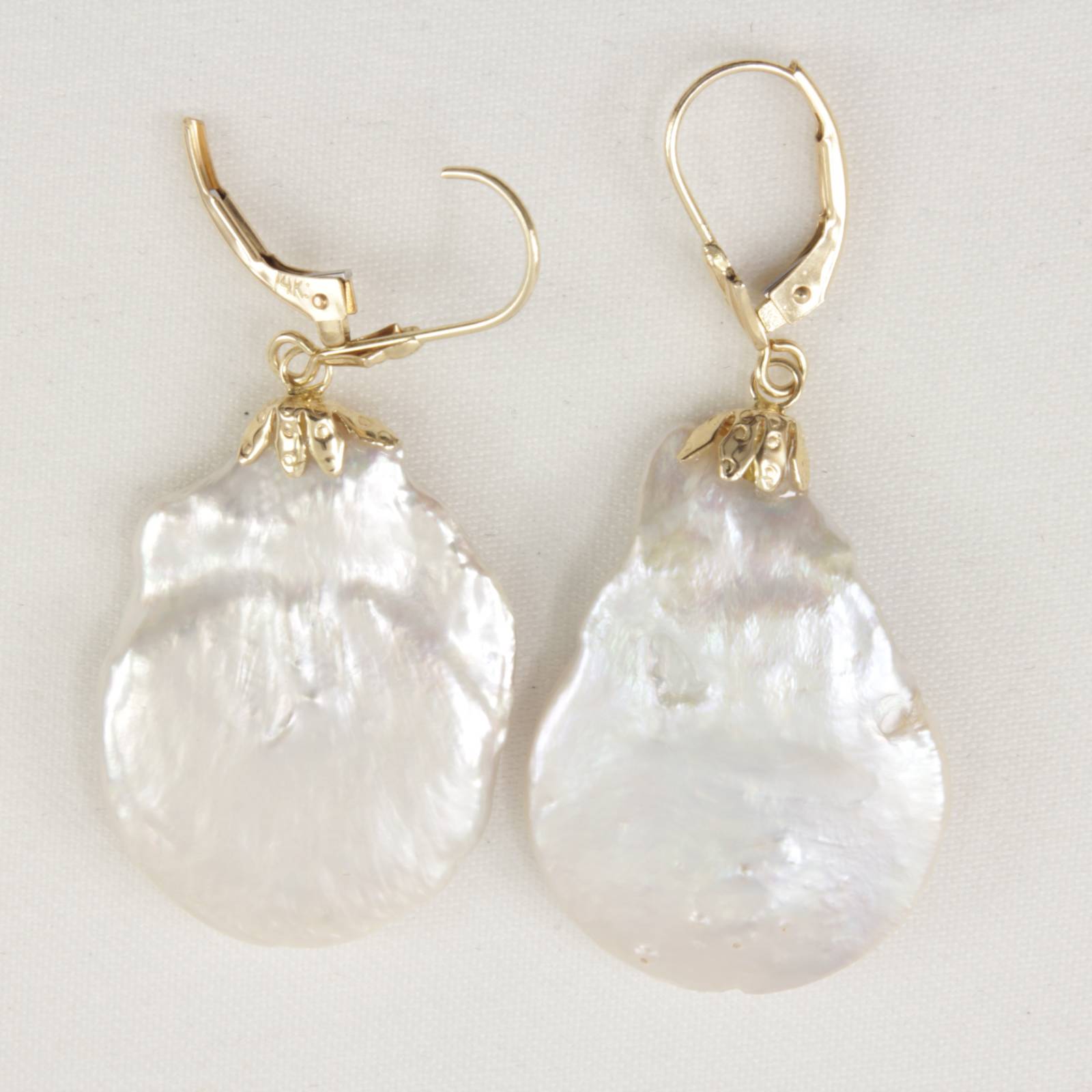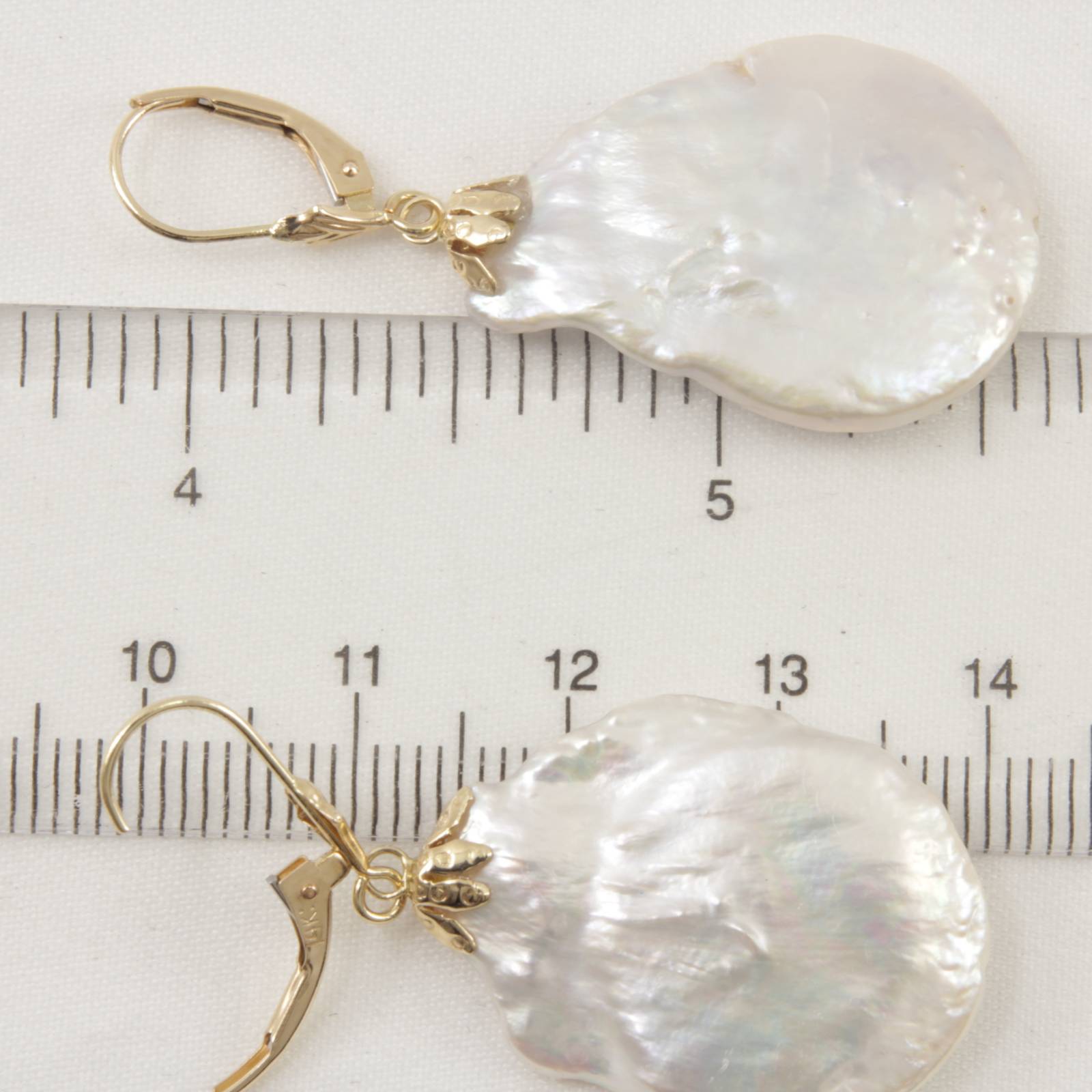 **14 k Yellow Gold Leverback Cup Baroque Coin Pearl Dangle Earrings**