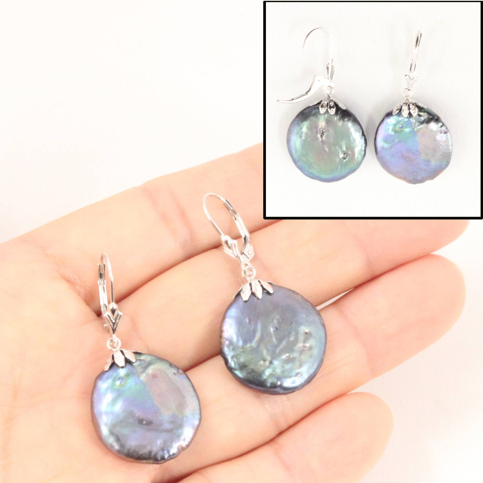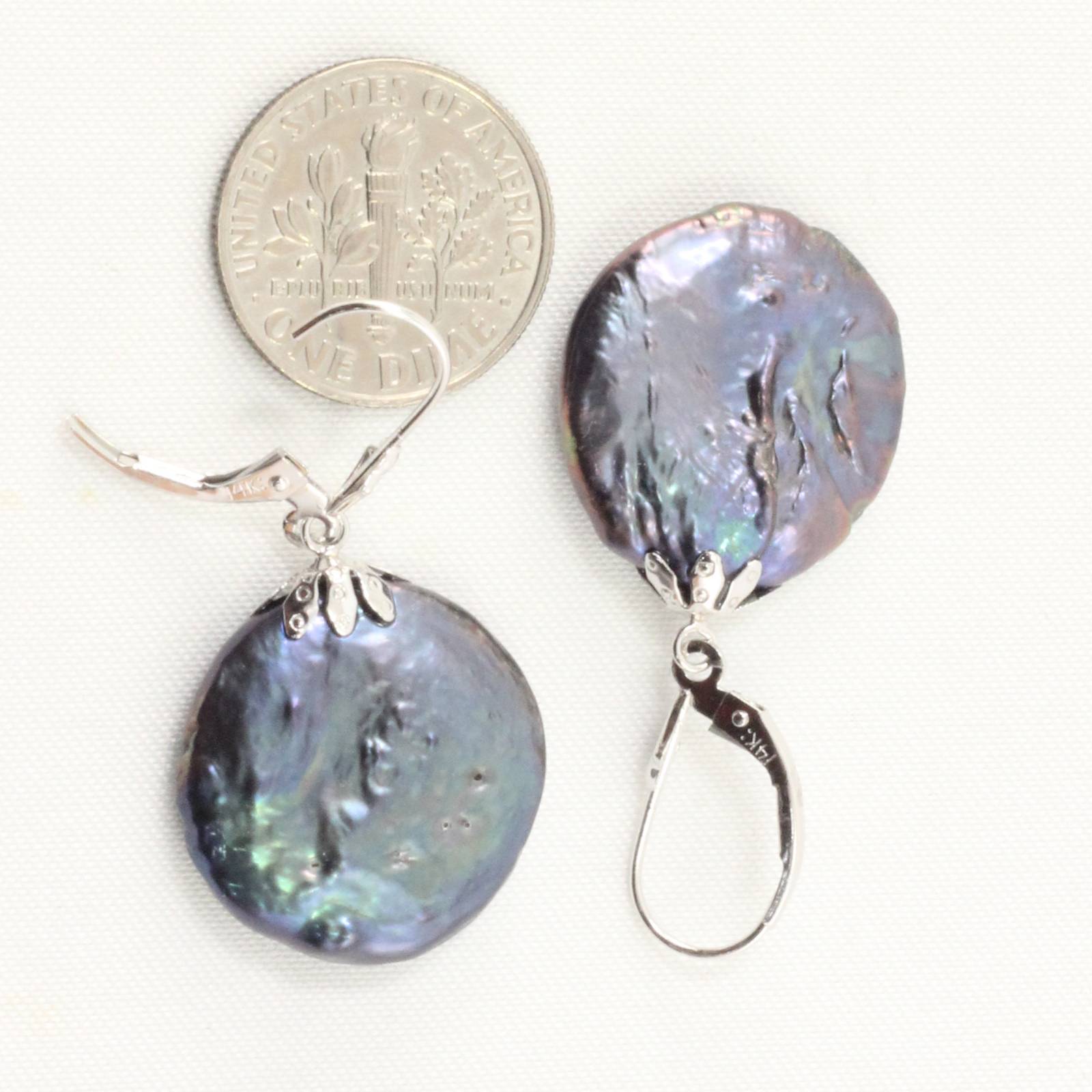 **14 k White Gold Leverback Cup Black Coin Pearl Dangle Earrings**