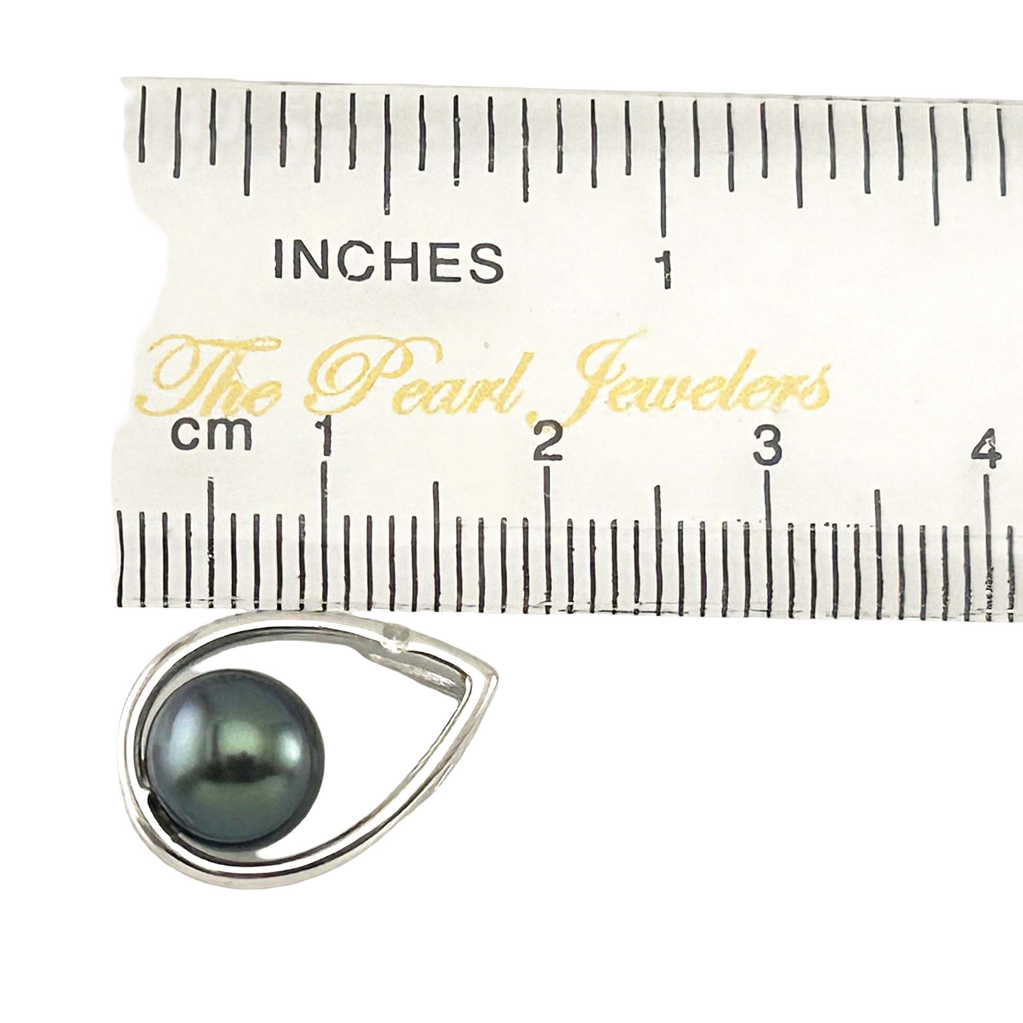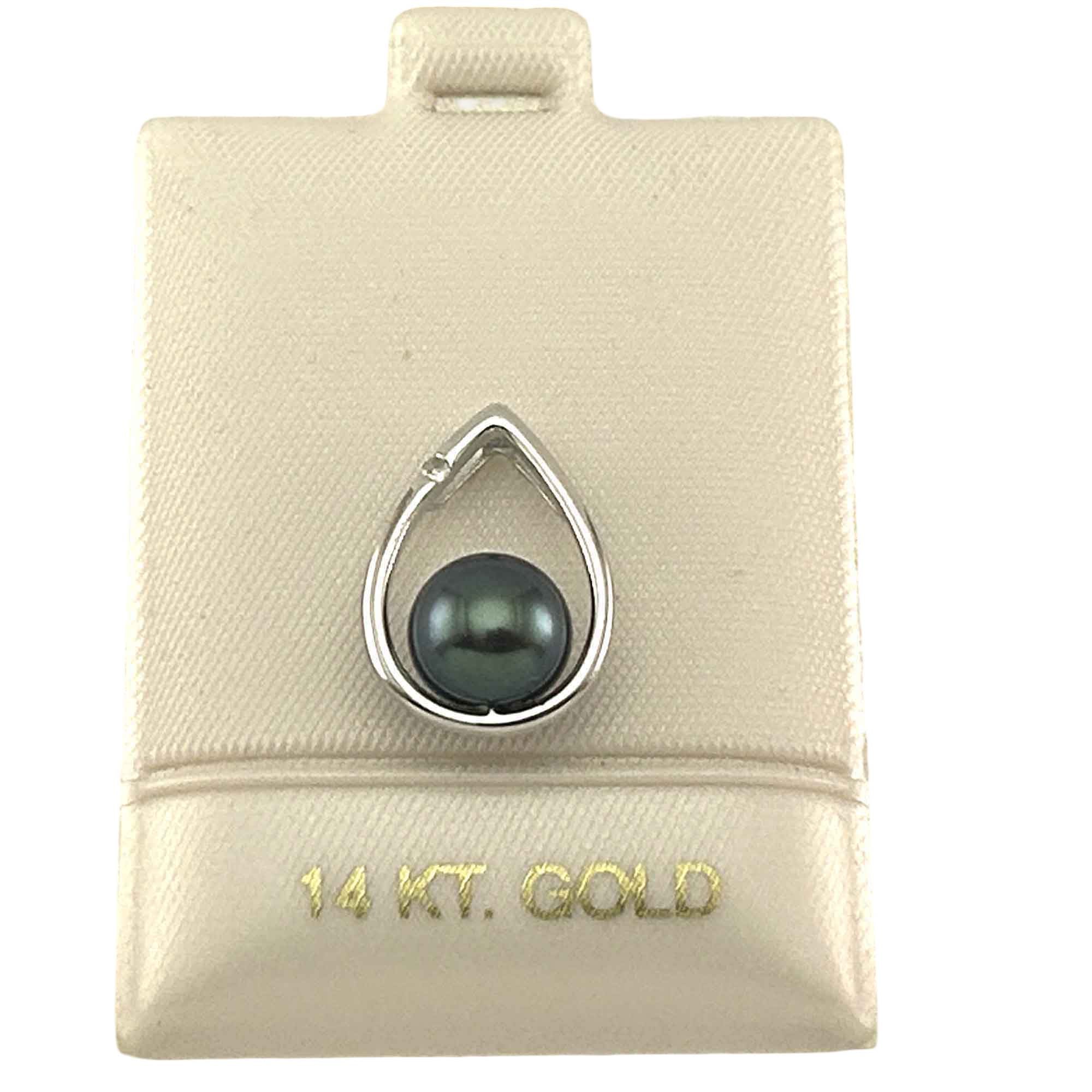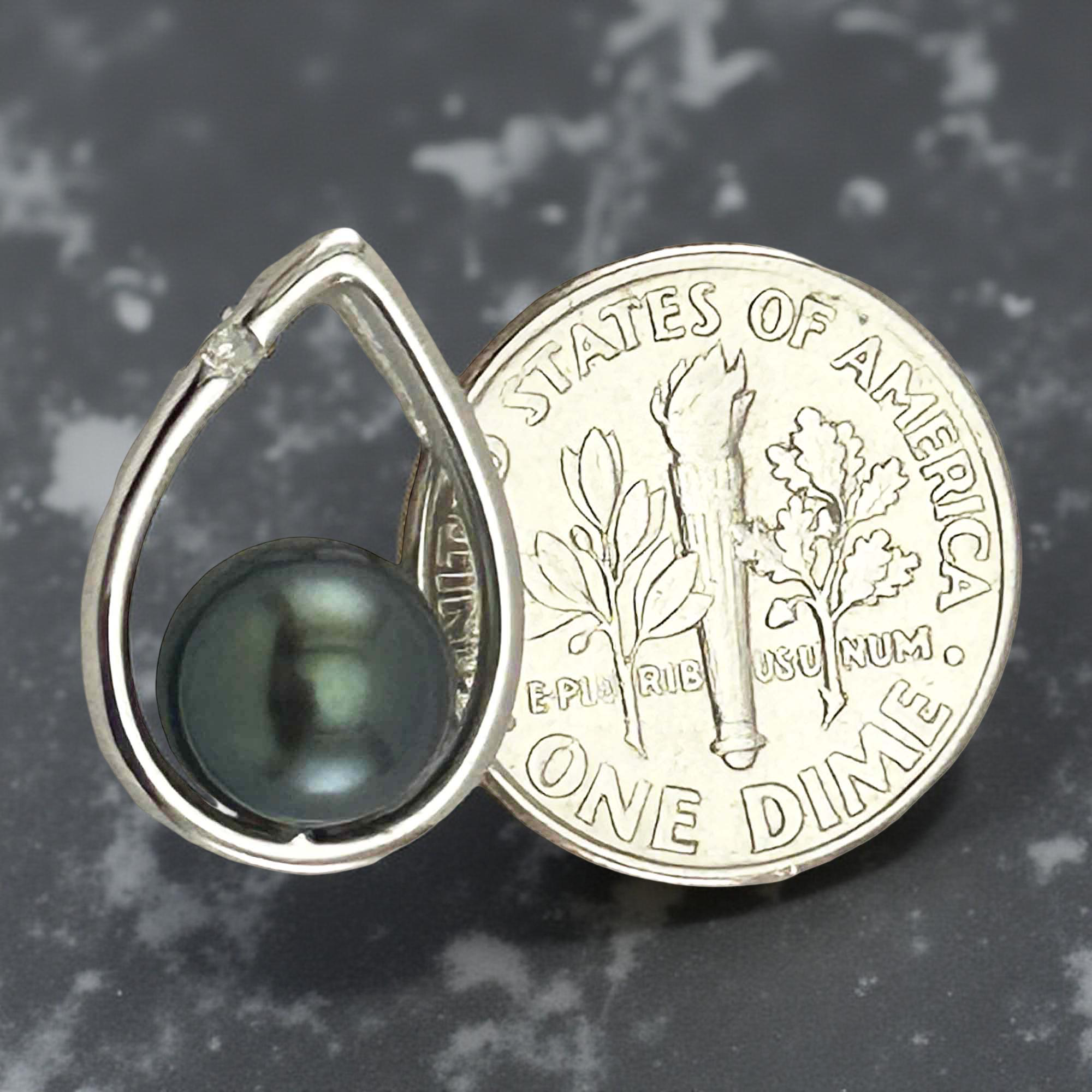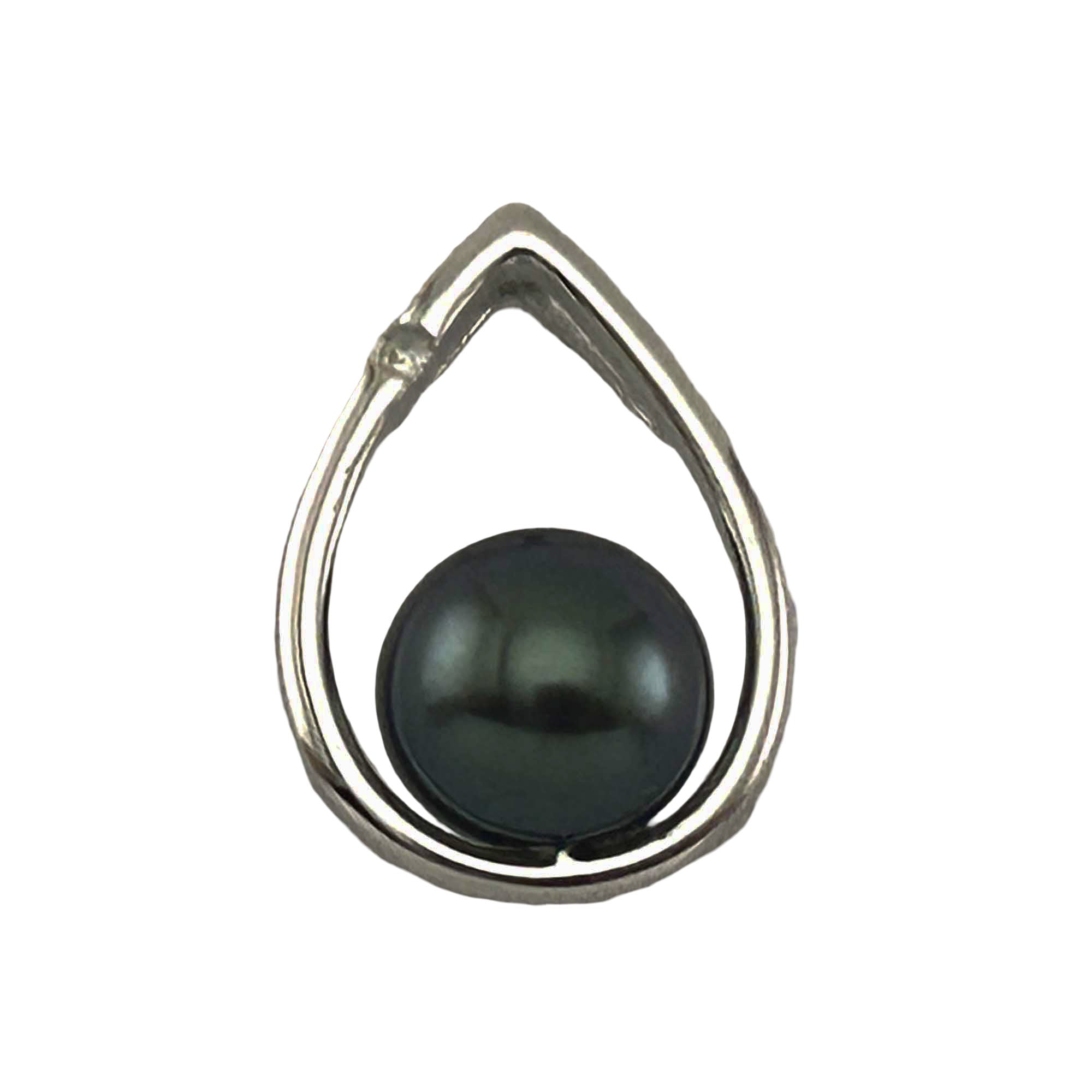A stunning peacock-tone pearl in a graceful white gold raindrop setting with one diamond spark. Refined and luxurious, designed for comfort and dependable daily wear.