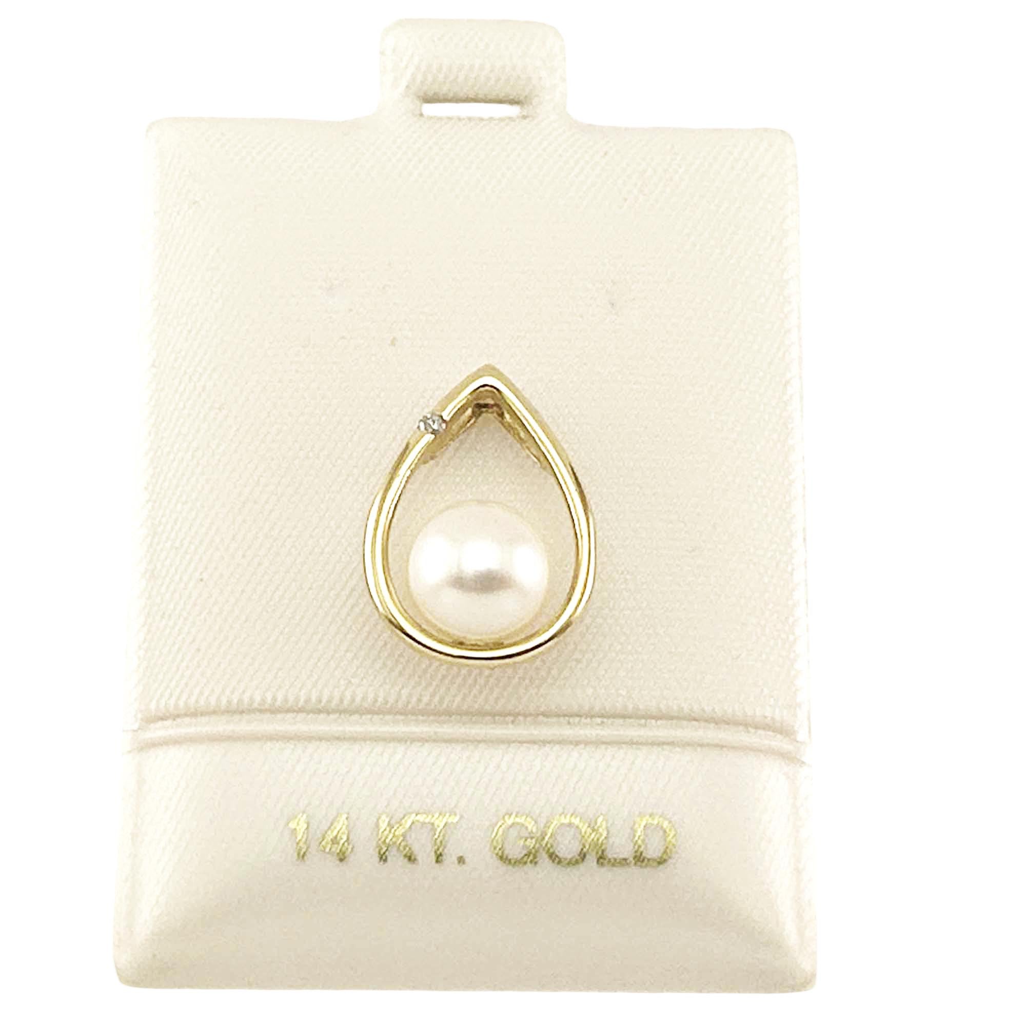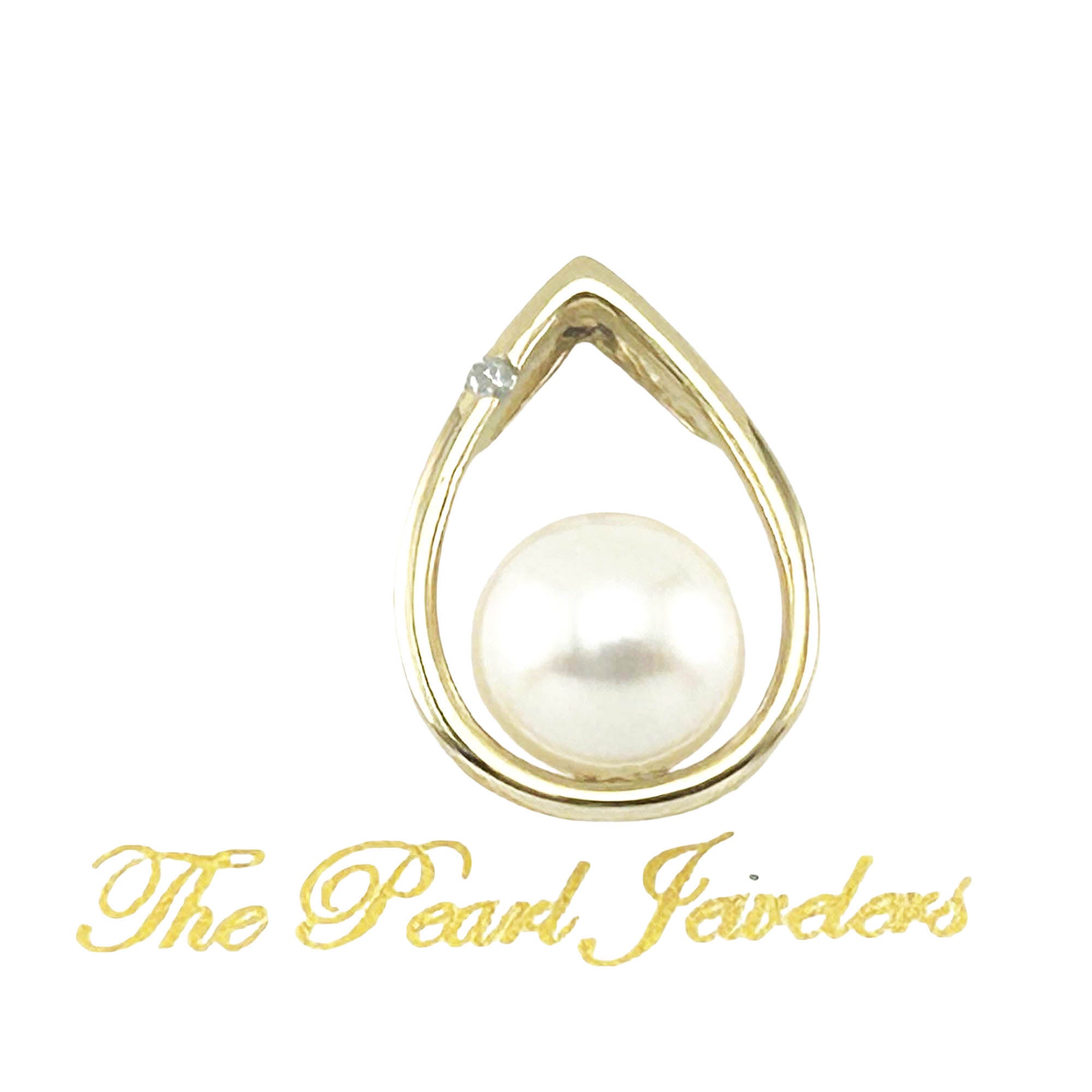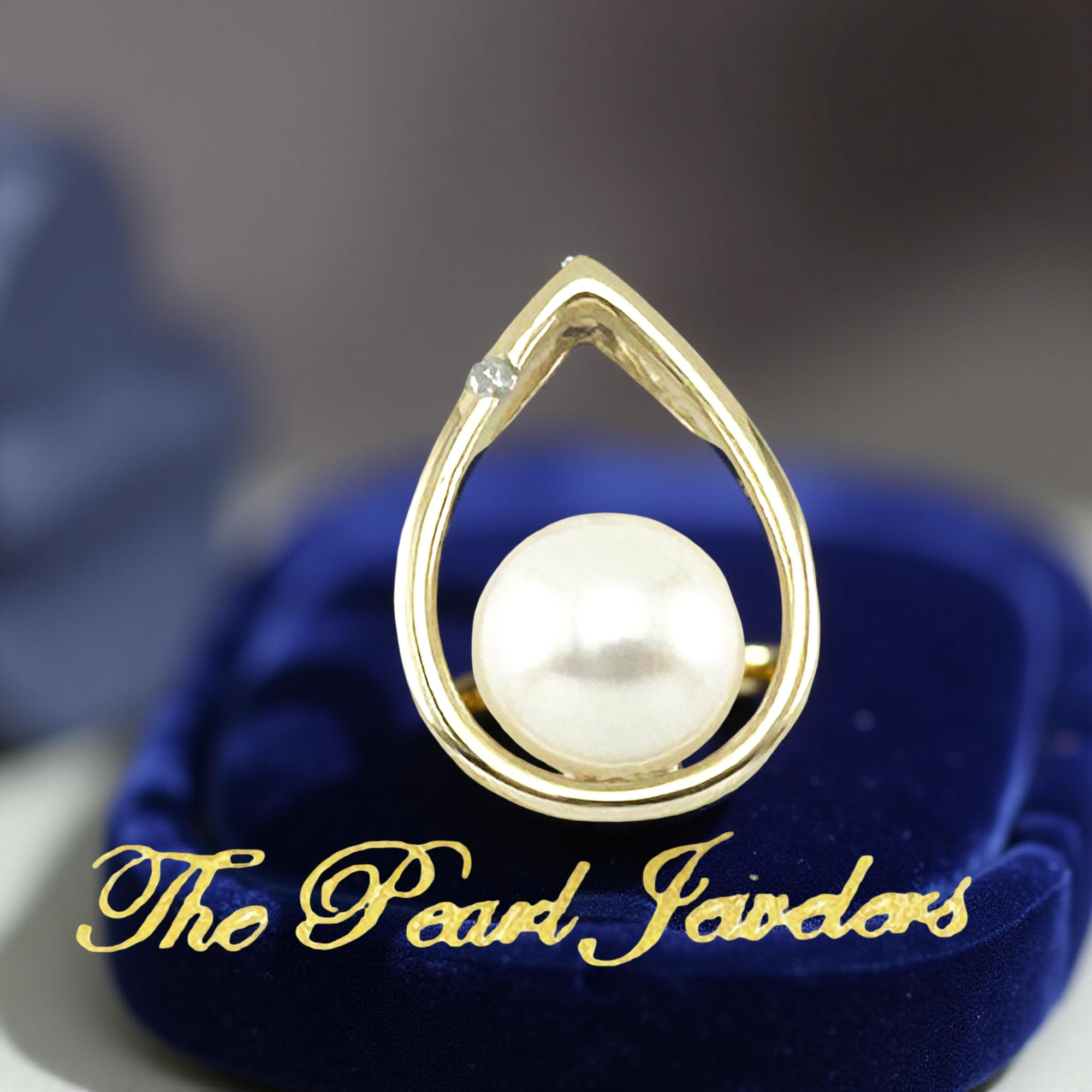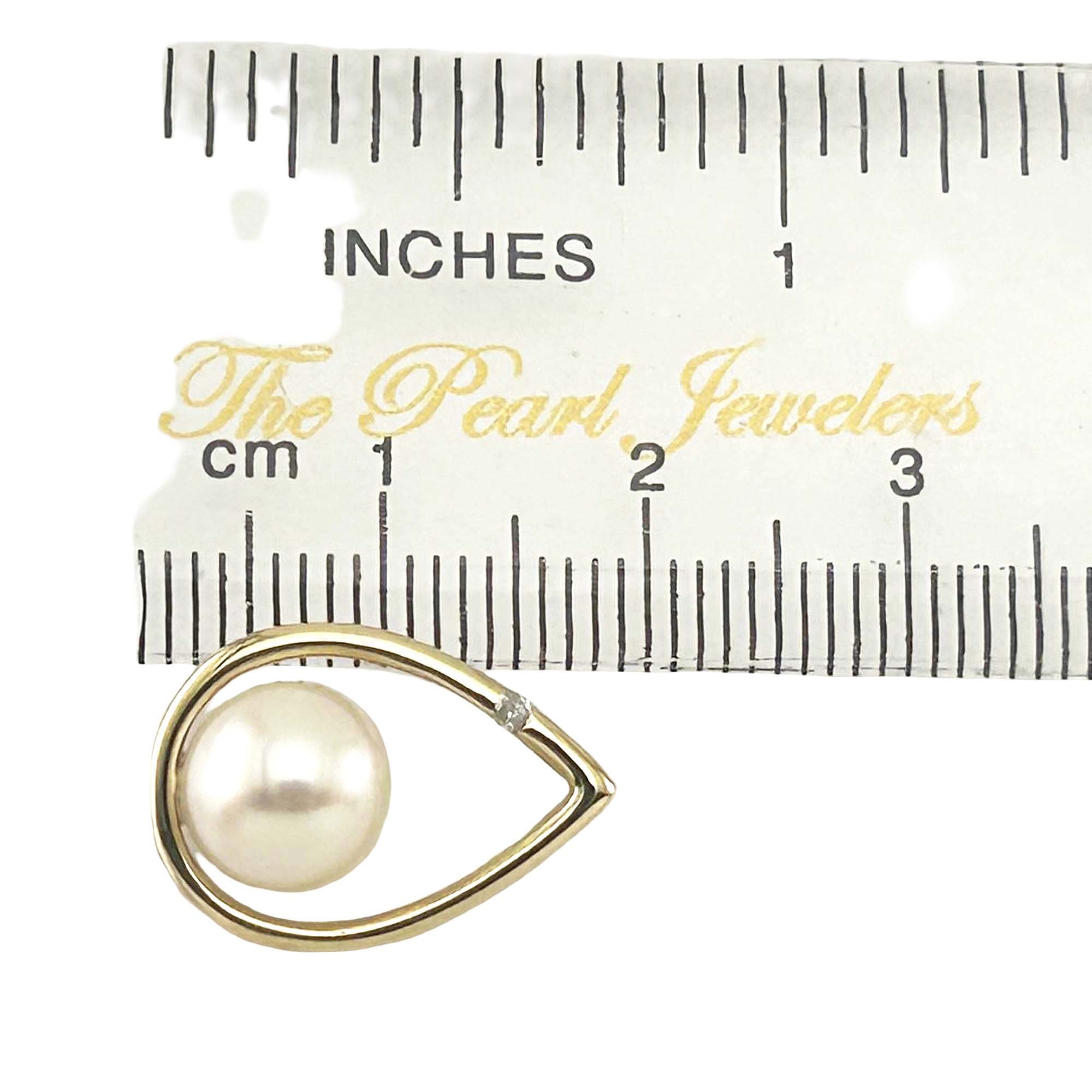 This round 8β8.5mm pearl rests in a graceful 14k yellow gold raindrop setting, accented with a brilliant diamond at the top, designed for comfort and dependable daily wear.