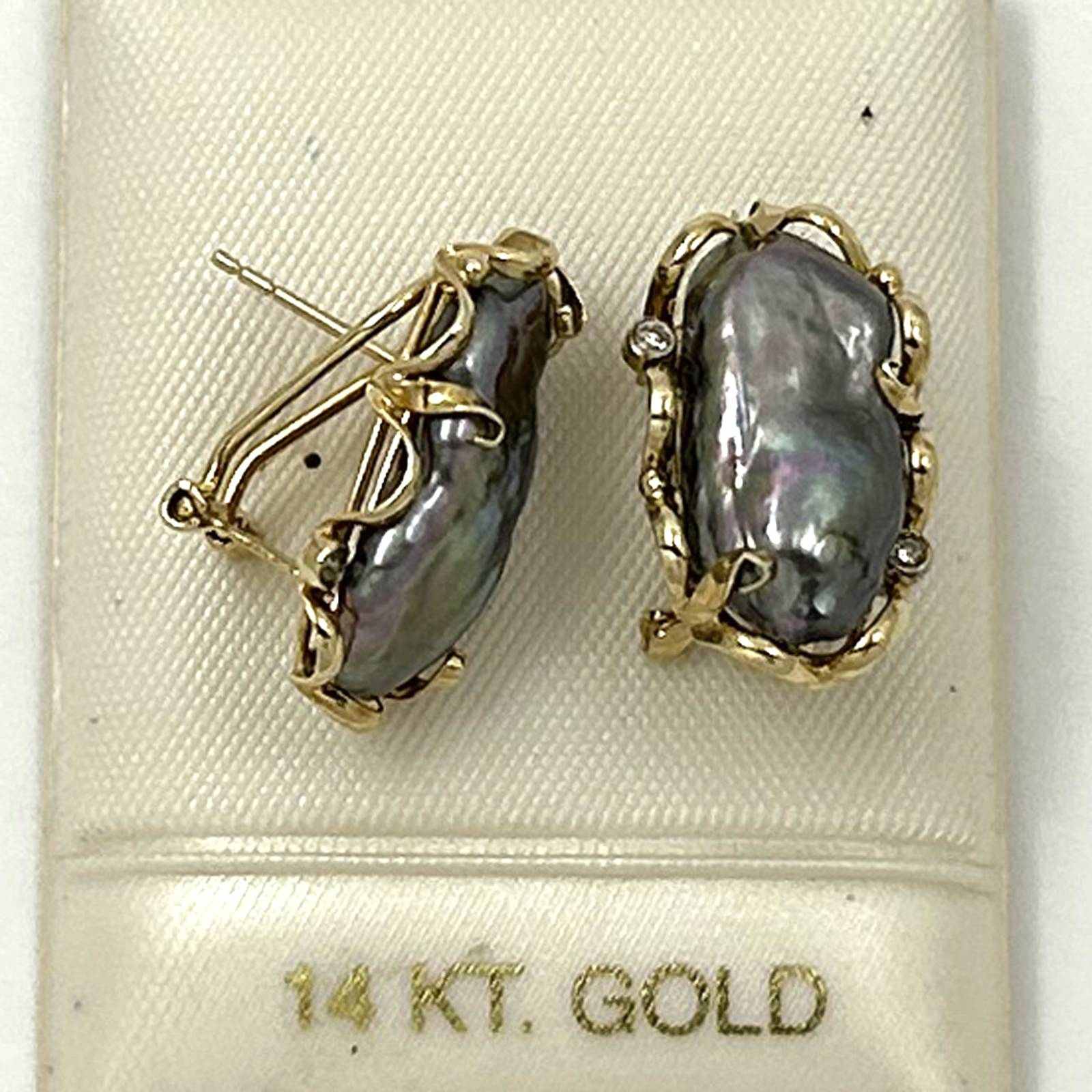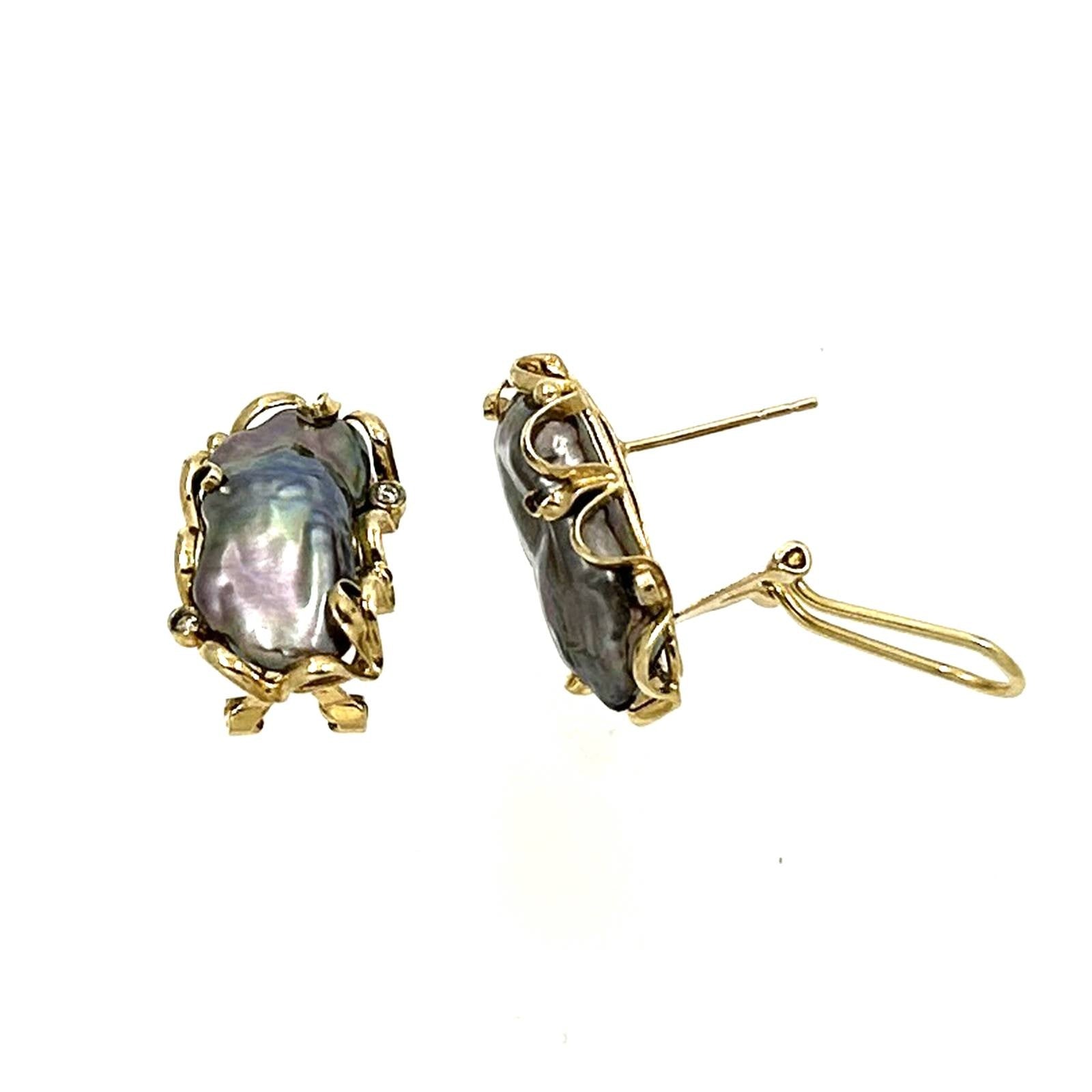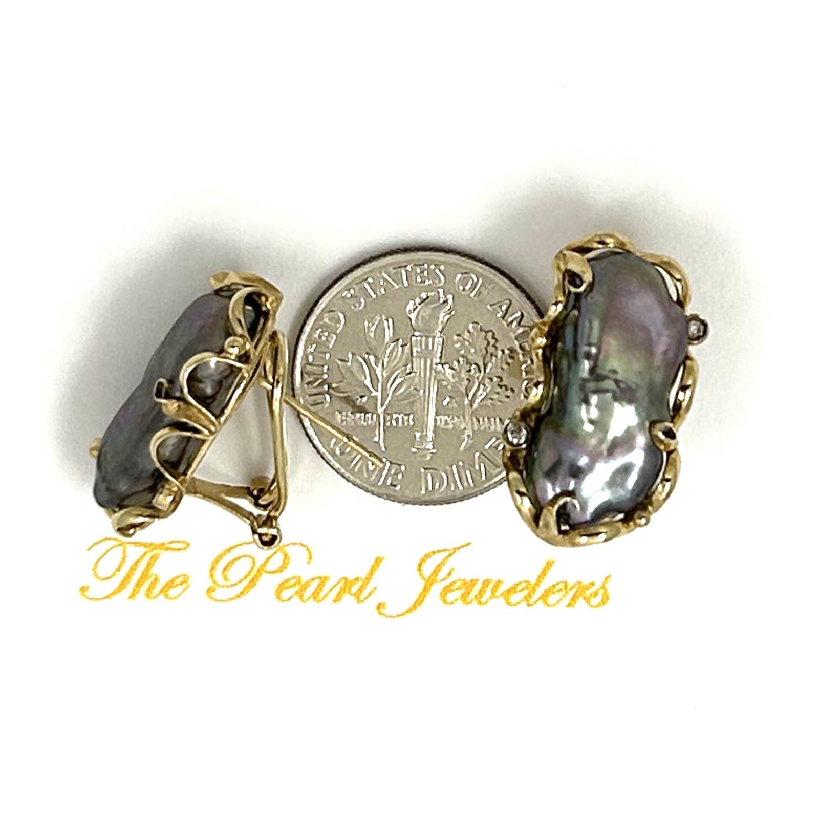 **Solid 14k Yellow Gold Omega Clip Diamond & Black Biwa Pearl Earrings**