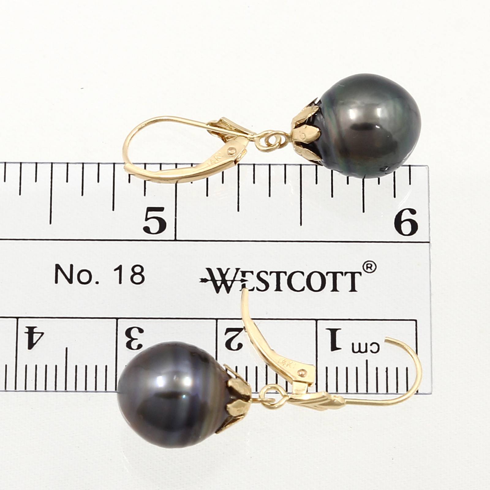 **14k Yellow Gold Leverback & Flower Cap Black Tahitian Pearl Dangle Earrings**