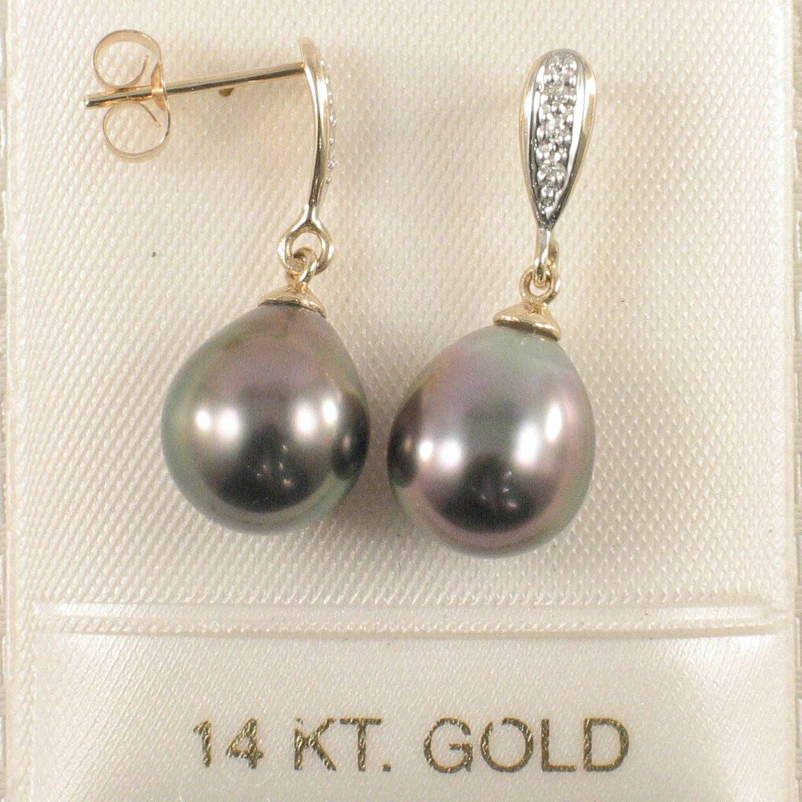 **14k Yellow Gold Peacock Raindrop Pearl Diamond Dangle Earrings**