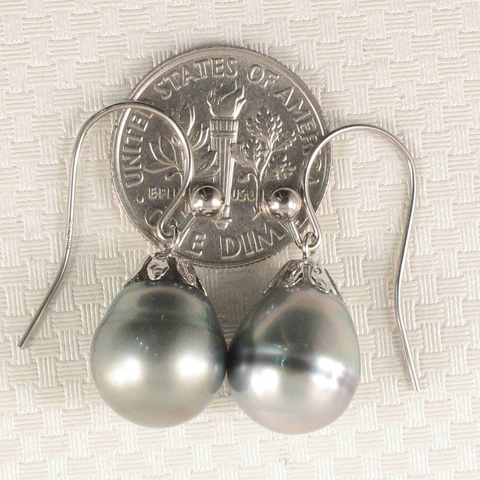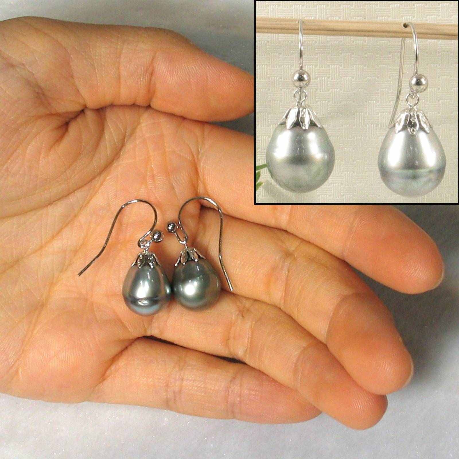 **14k White Gold Fish Hook Flower Cap Tahitian Pearl Dangle Earrings**