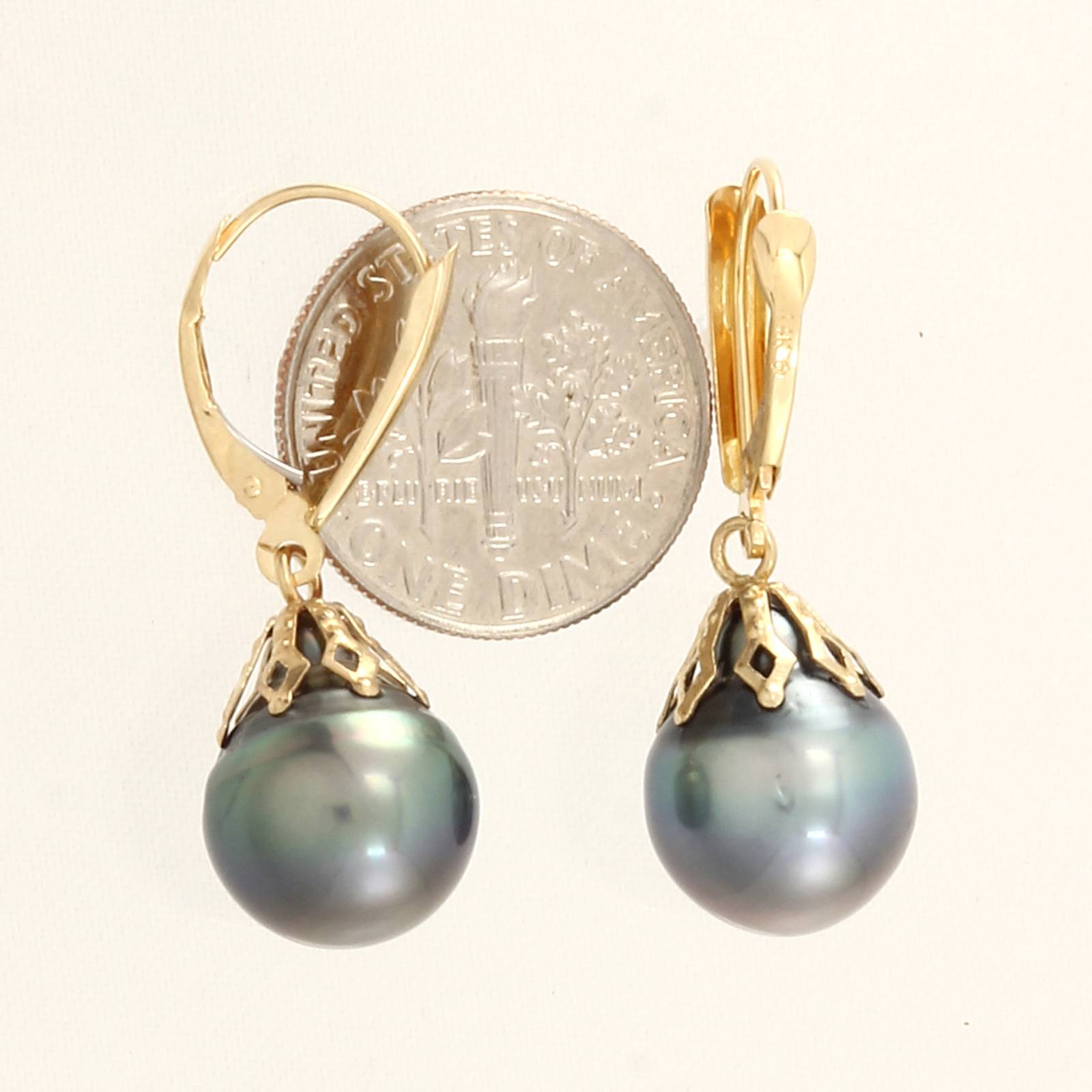 Baroque Black Gray Tahitian Pearl Shield Lever Dangle Earrings – 14k Yellow Gold