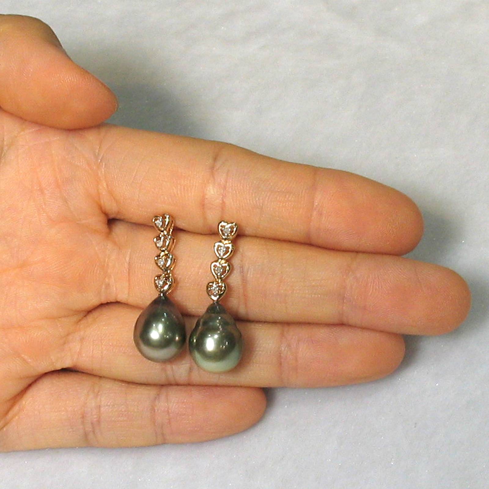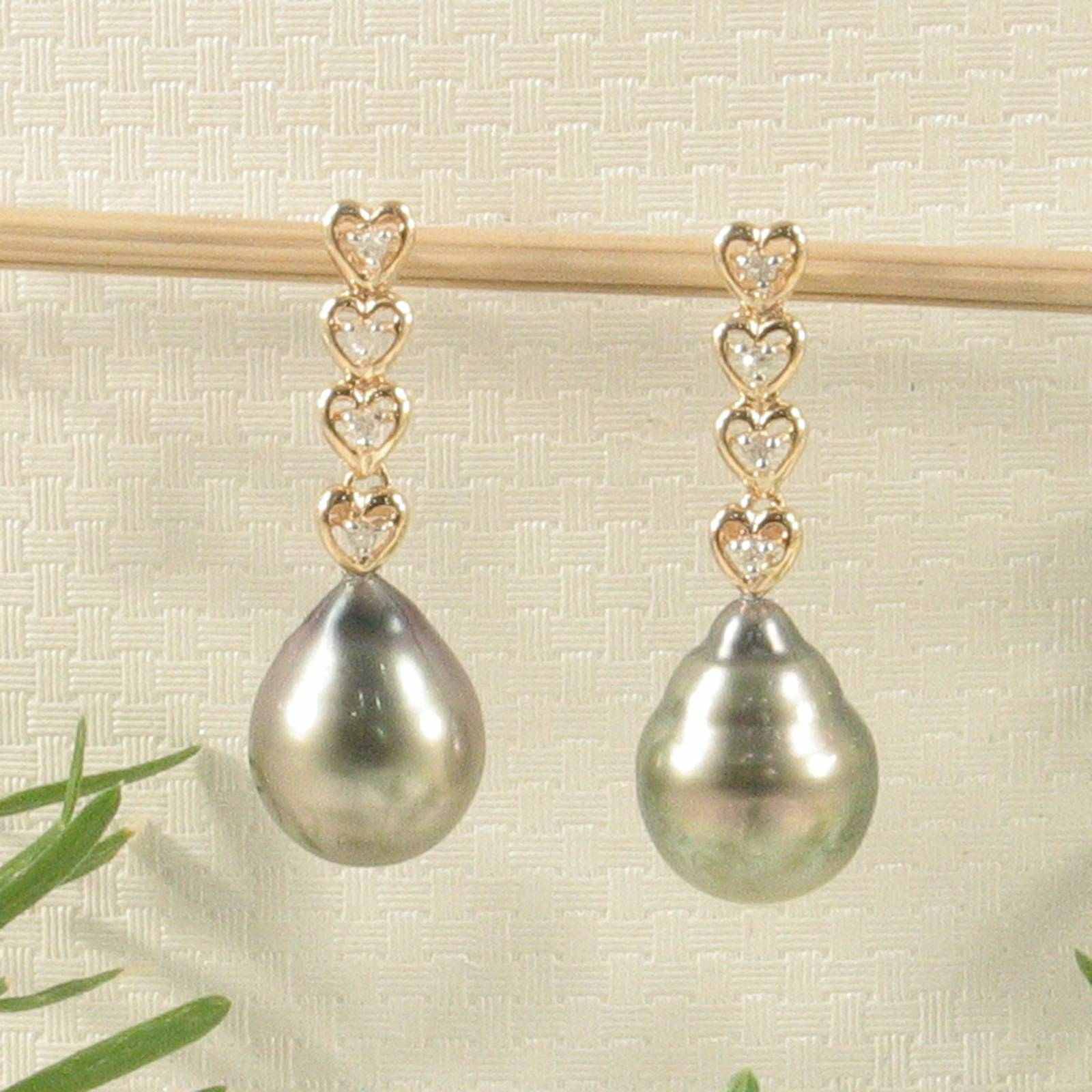 **Silver Gray Tahitian Pearl & Diamond Heart Drop Earrings – 14k Yellow Gold**