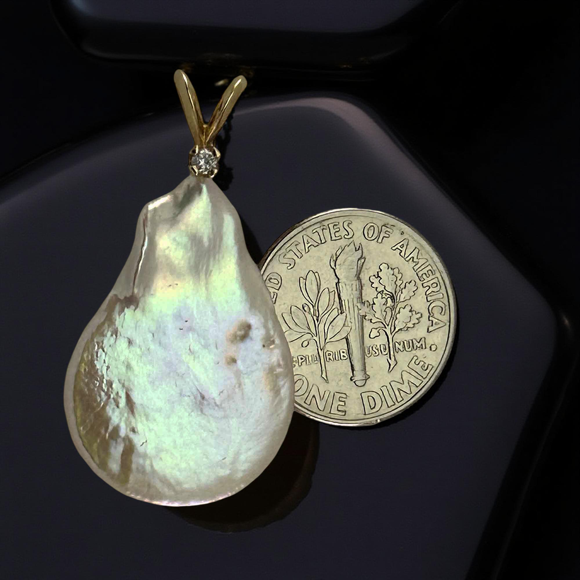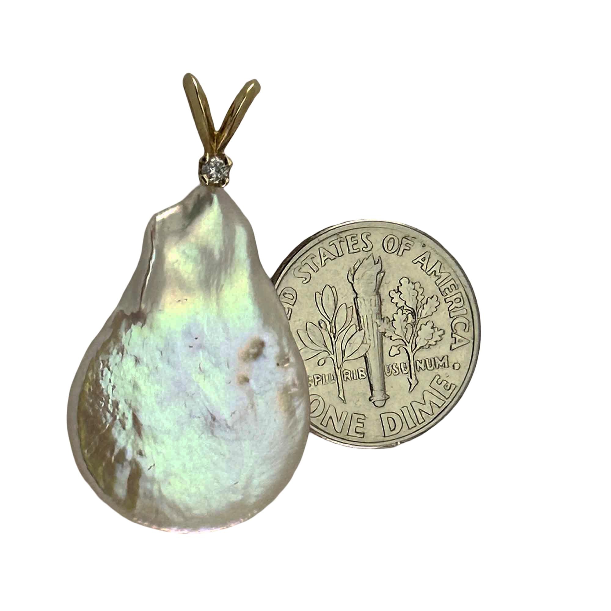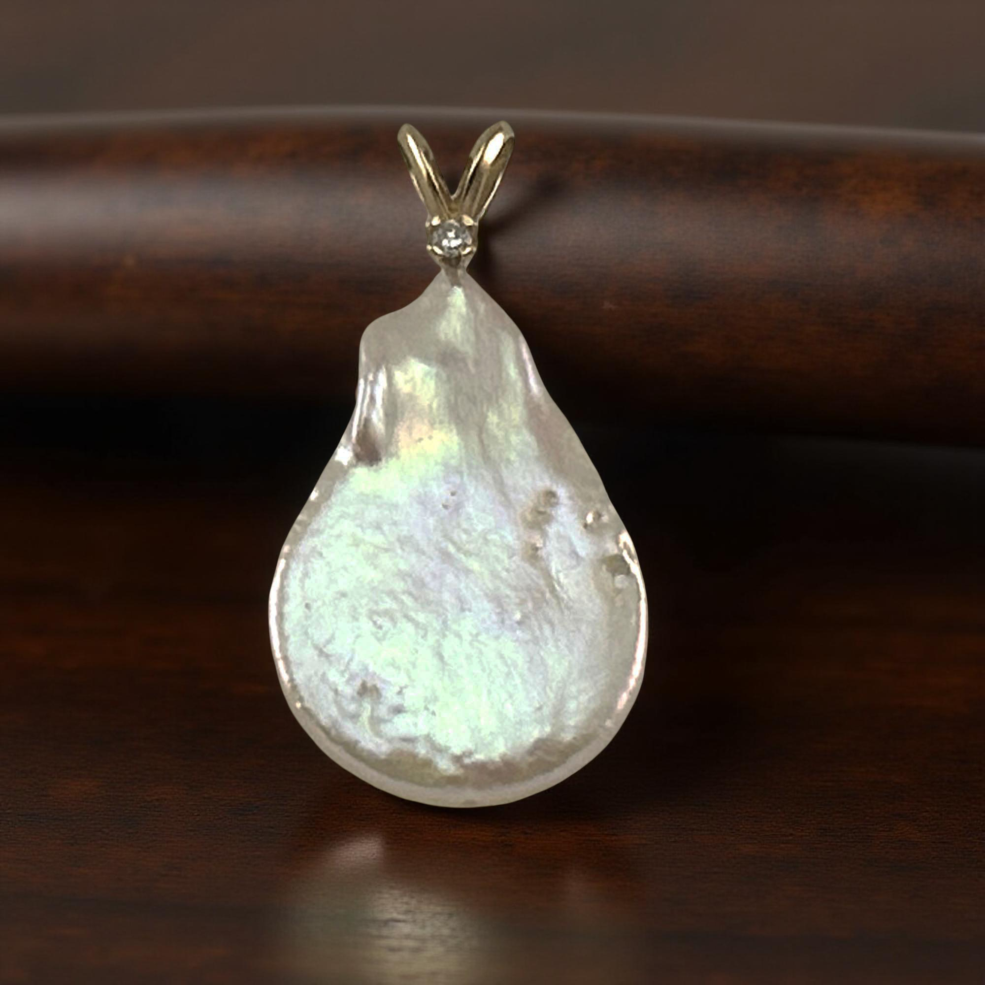 A luminous 19mm white baroque coin pearl set in a unique 14k yellow gold rabbit-ear bail with sparkling diamond. Artistic and bold, designed for comfort and dependable daily wear.