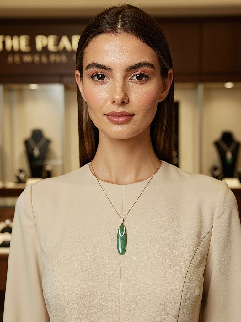 An elegant green jade cabochon pendant accented by three sparkling round diamonds set in solid 14K yellow gold. Its long, graceful silhouette creates a refined and timeless look.
