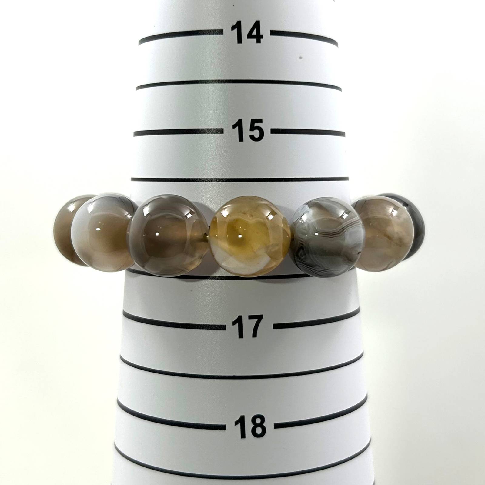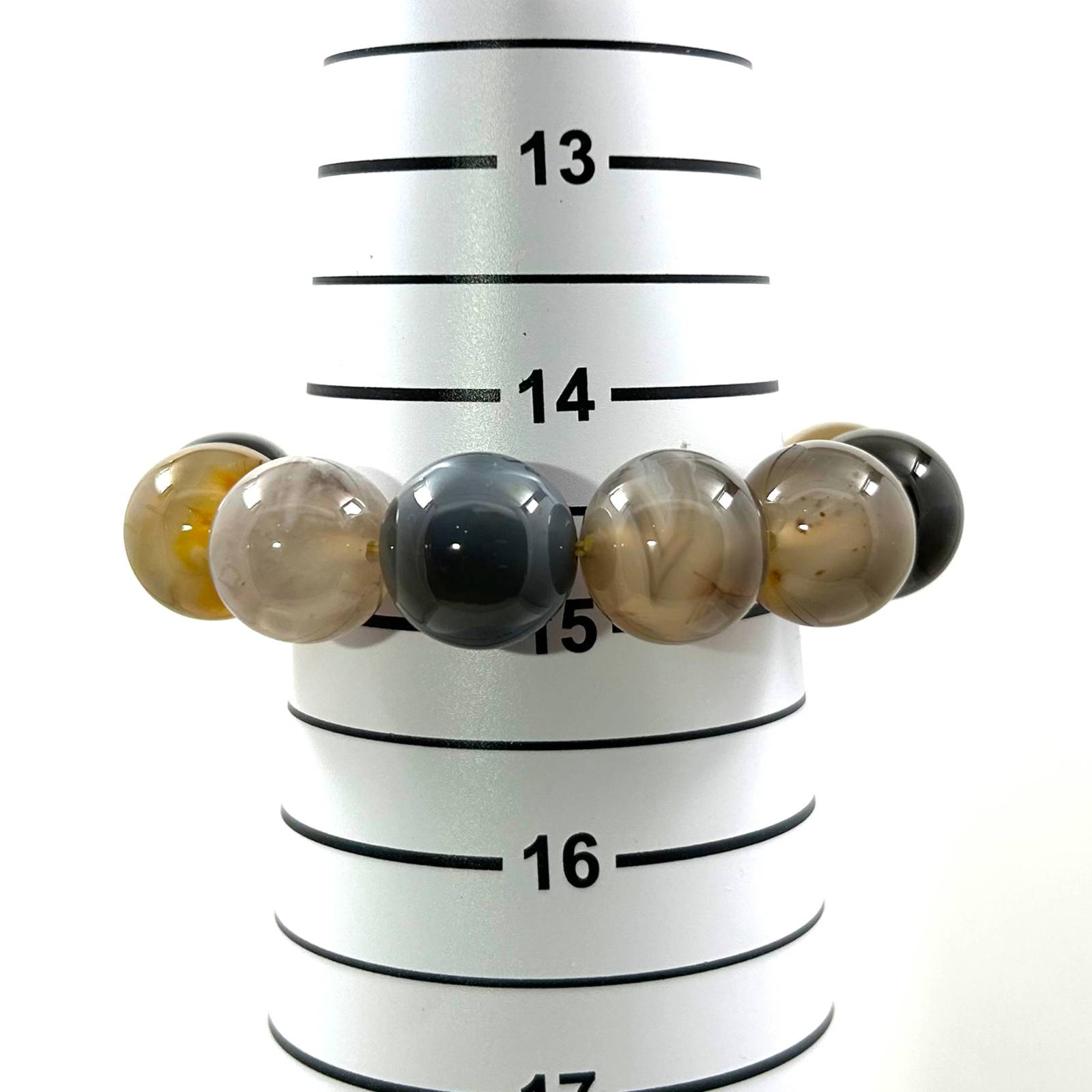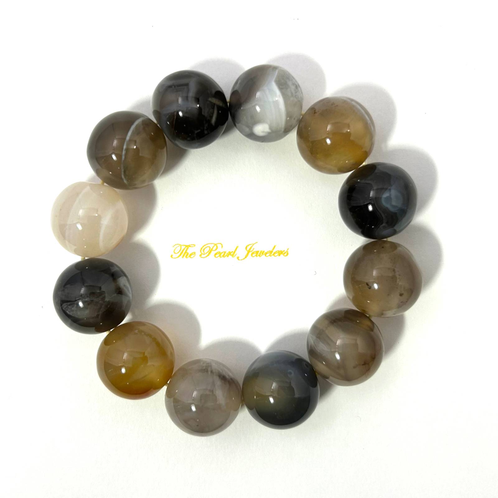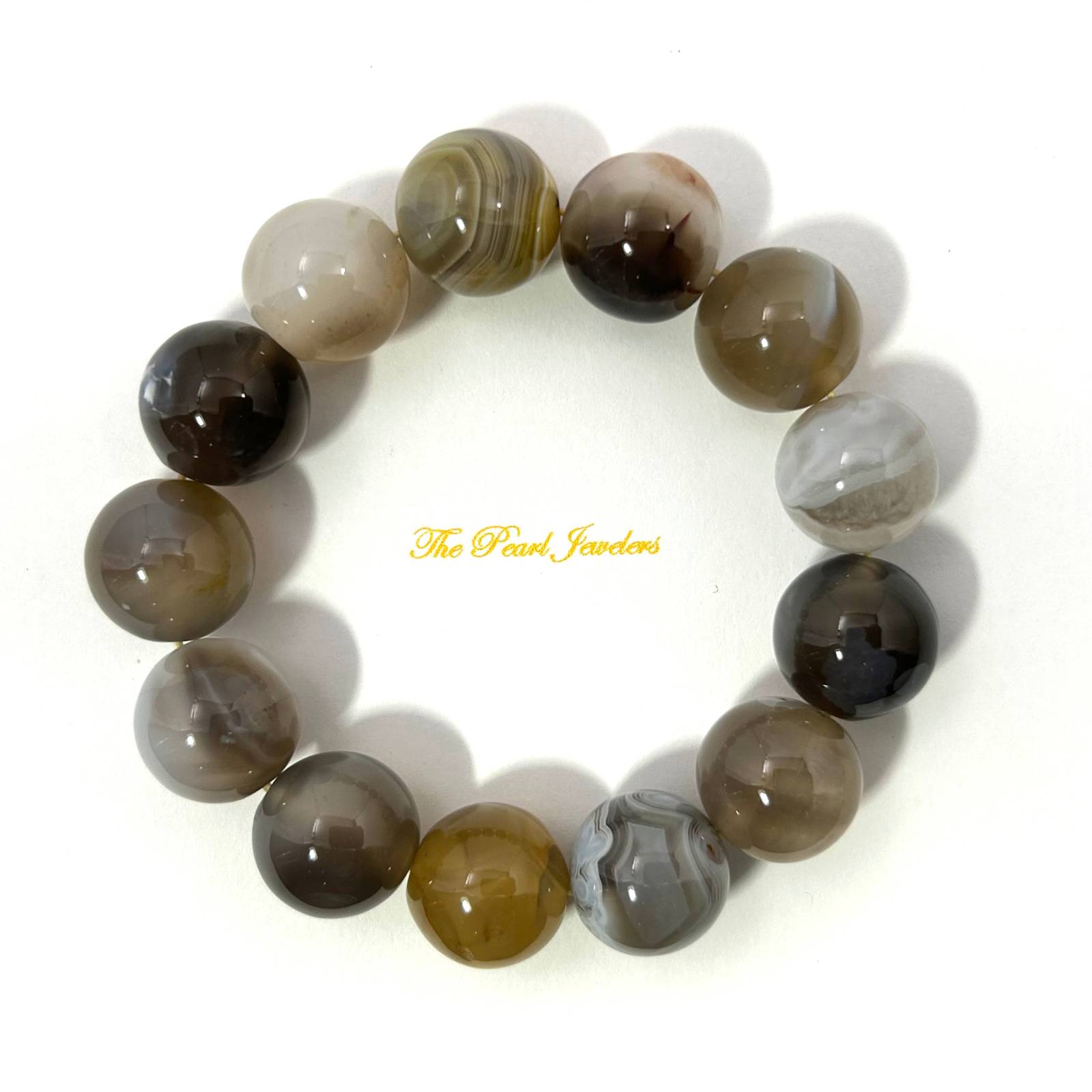 This stretch bracelet features large 16mm Persian Gulf agate beads, offering a grounded energy and an earthy mix-gray color tone.
