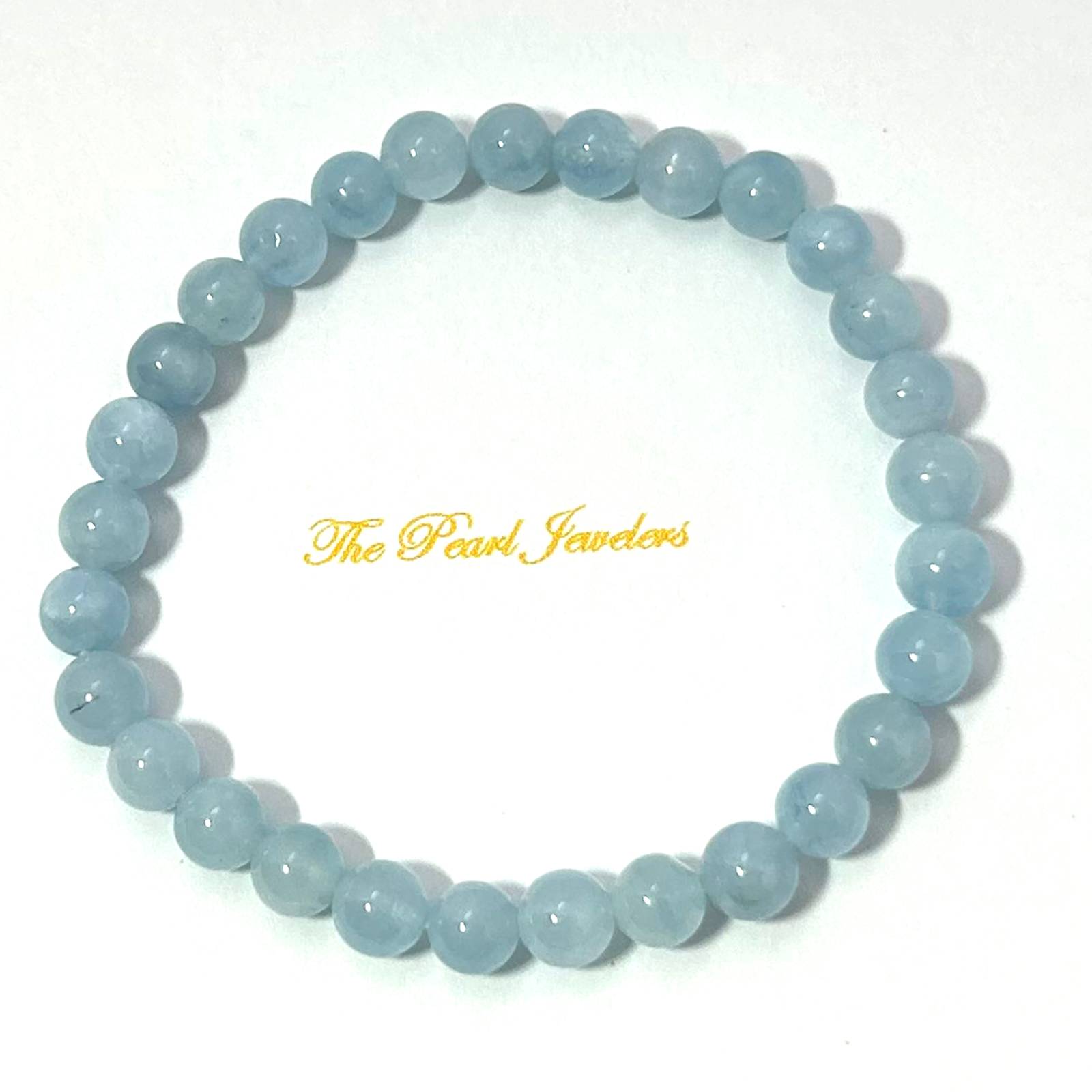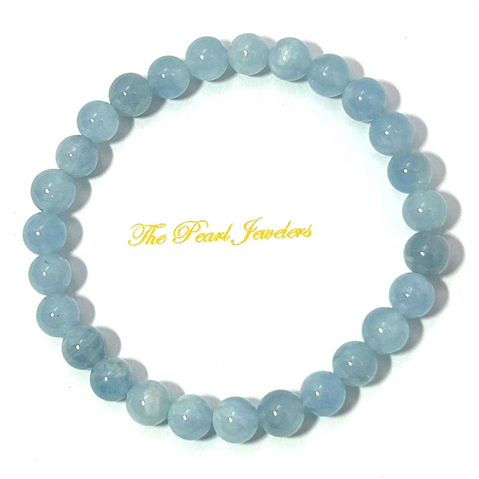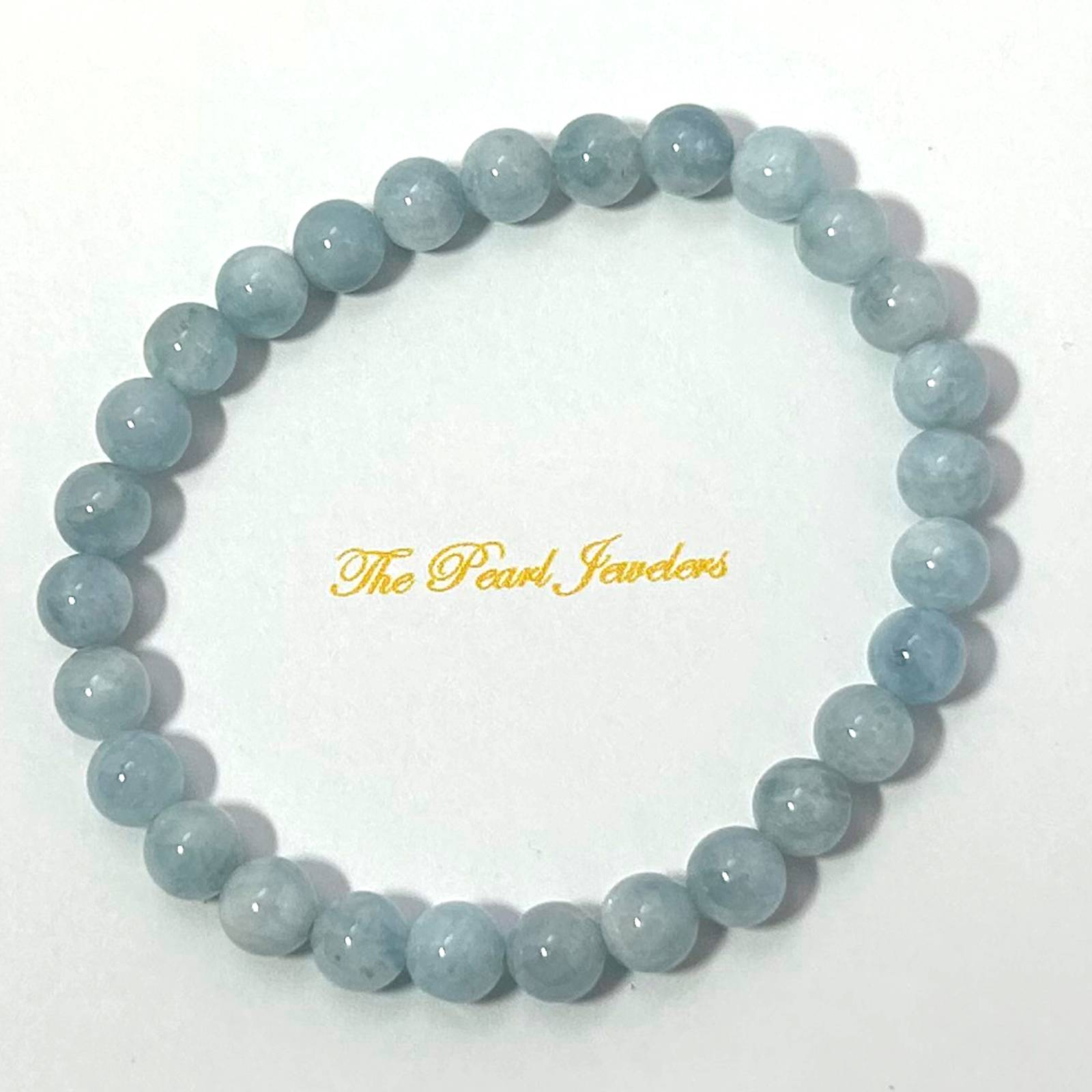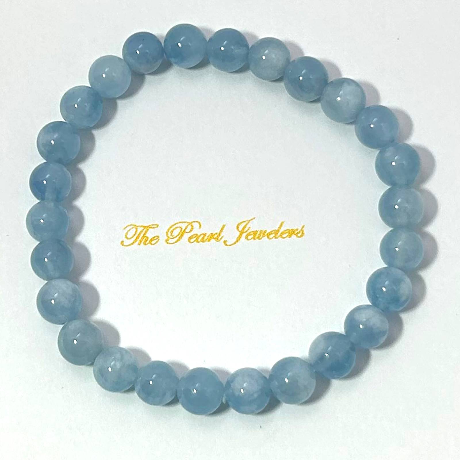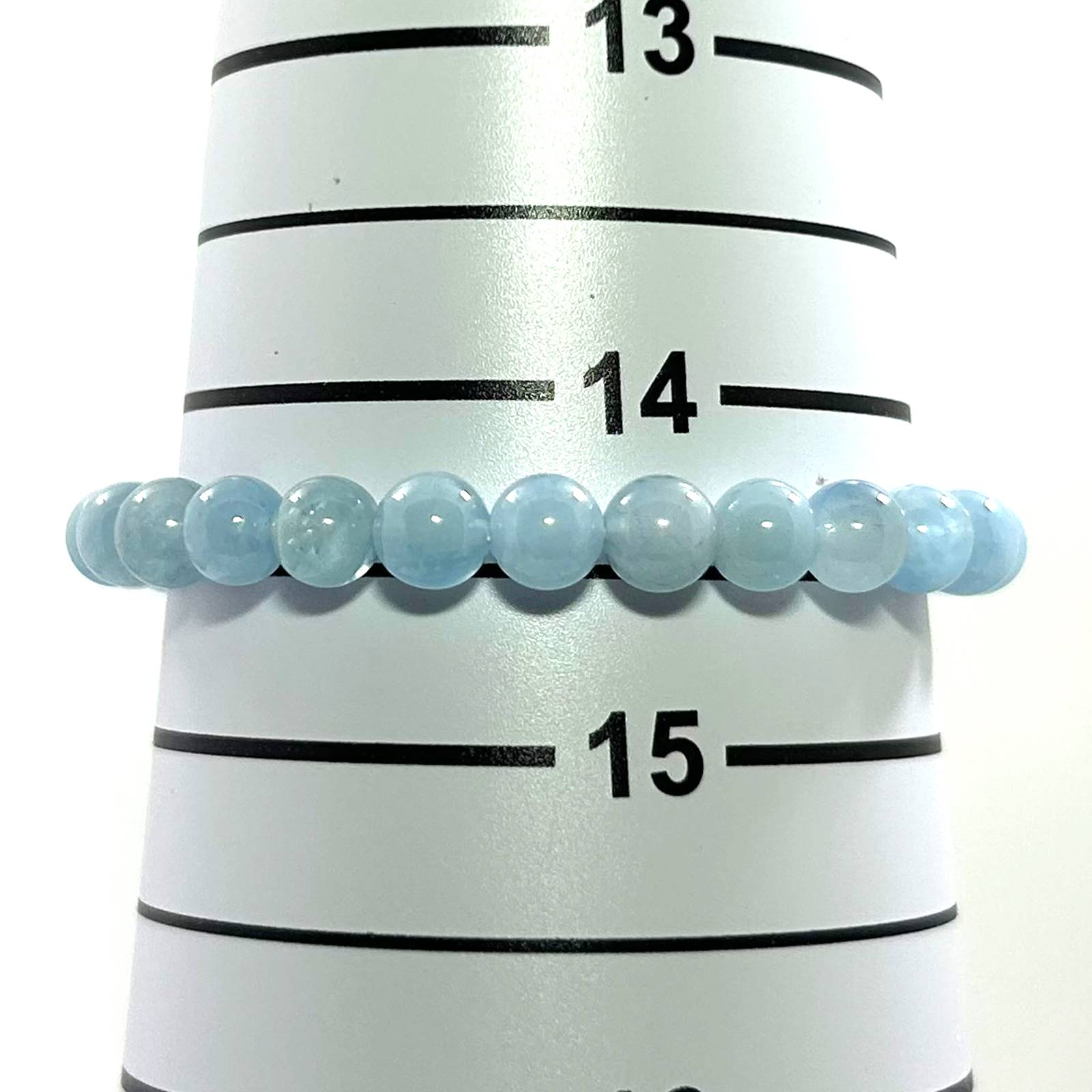 This bracelet features 6โ€“6.5mm natural aquamarine beads. A light and simple everyday piece to encourage peace and prosperity.