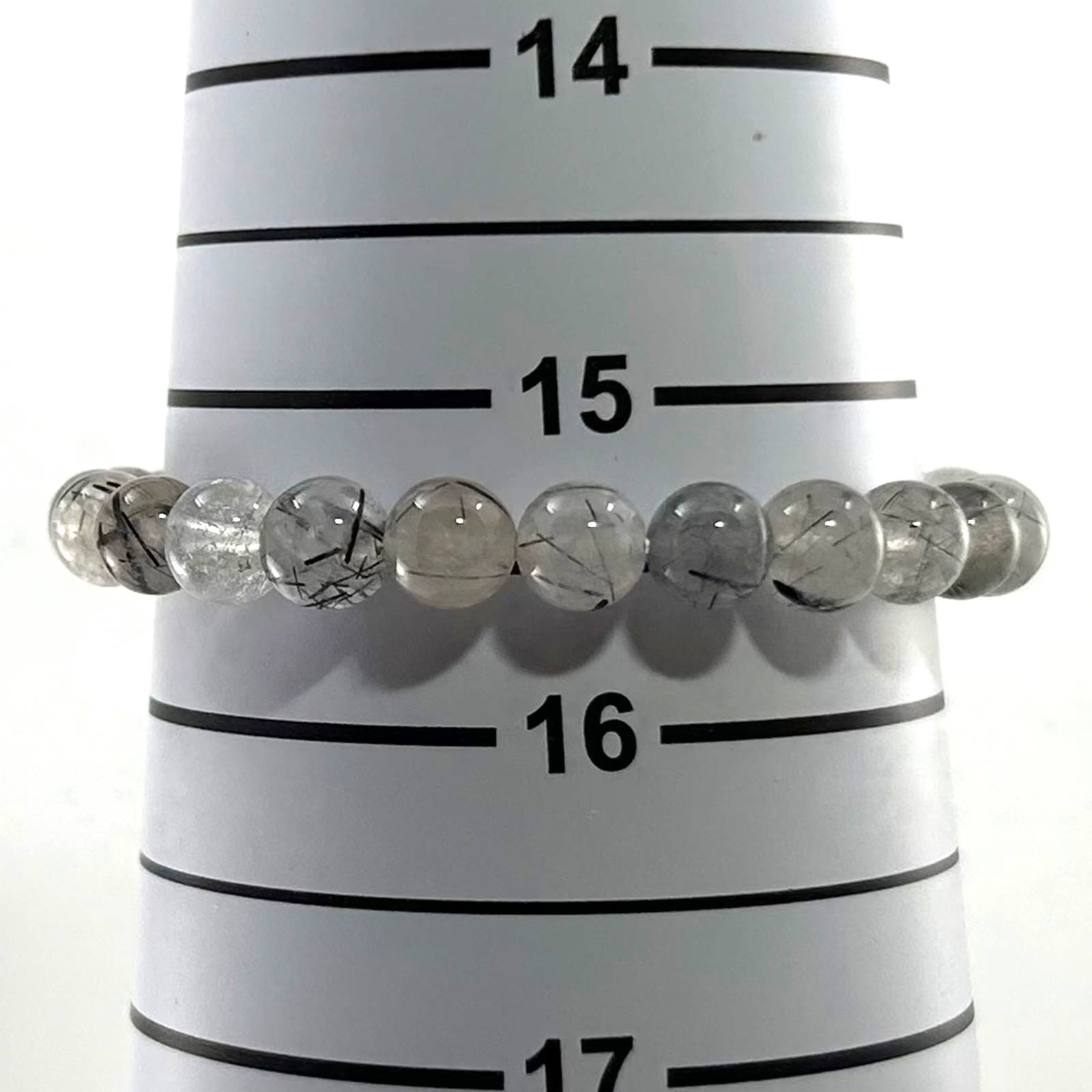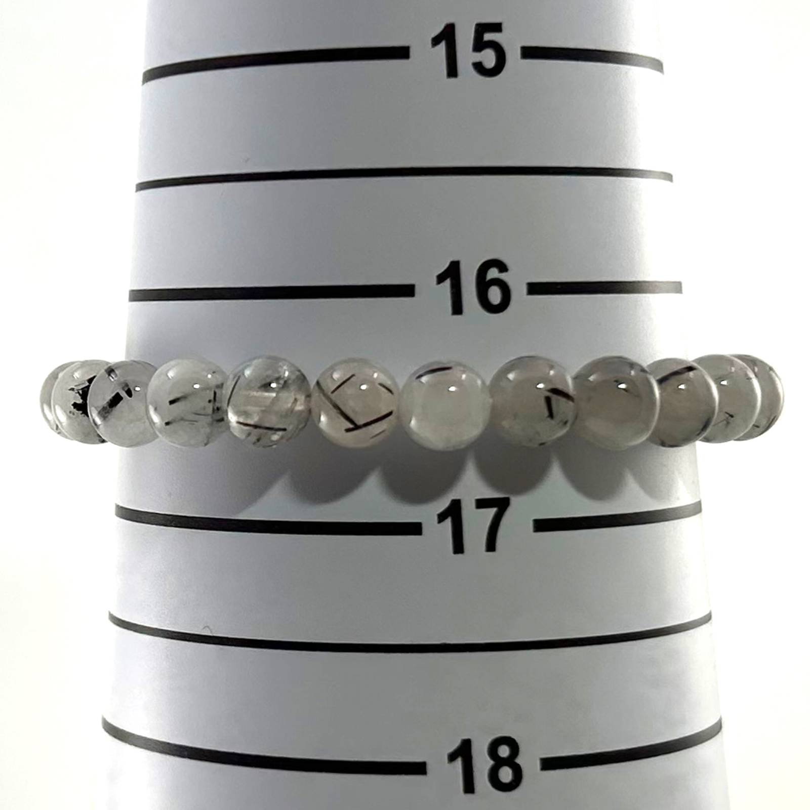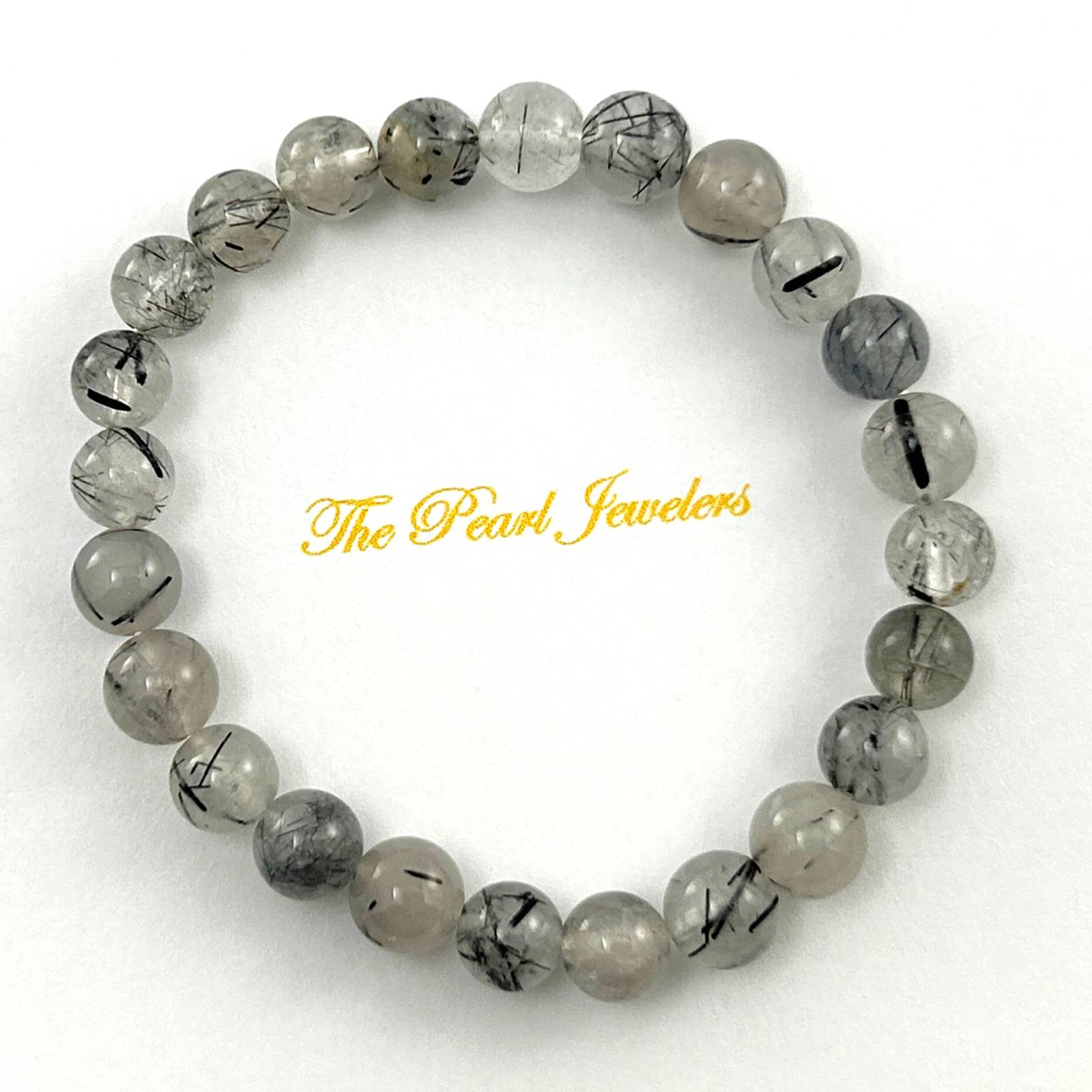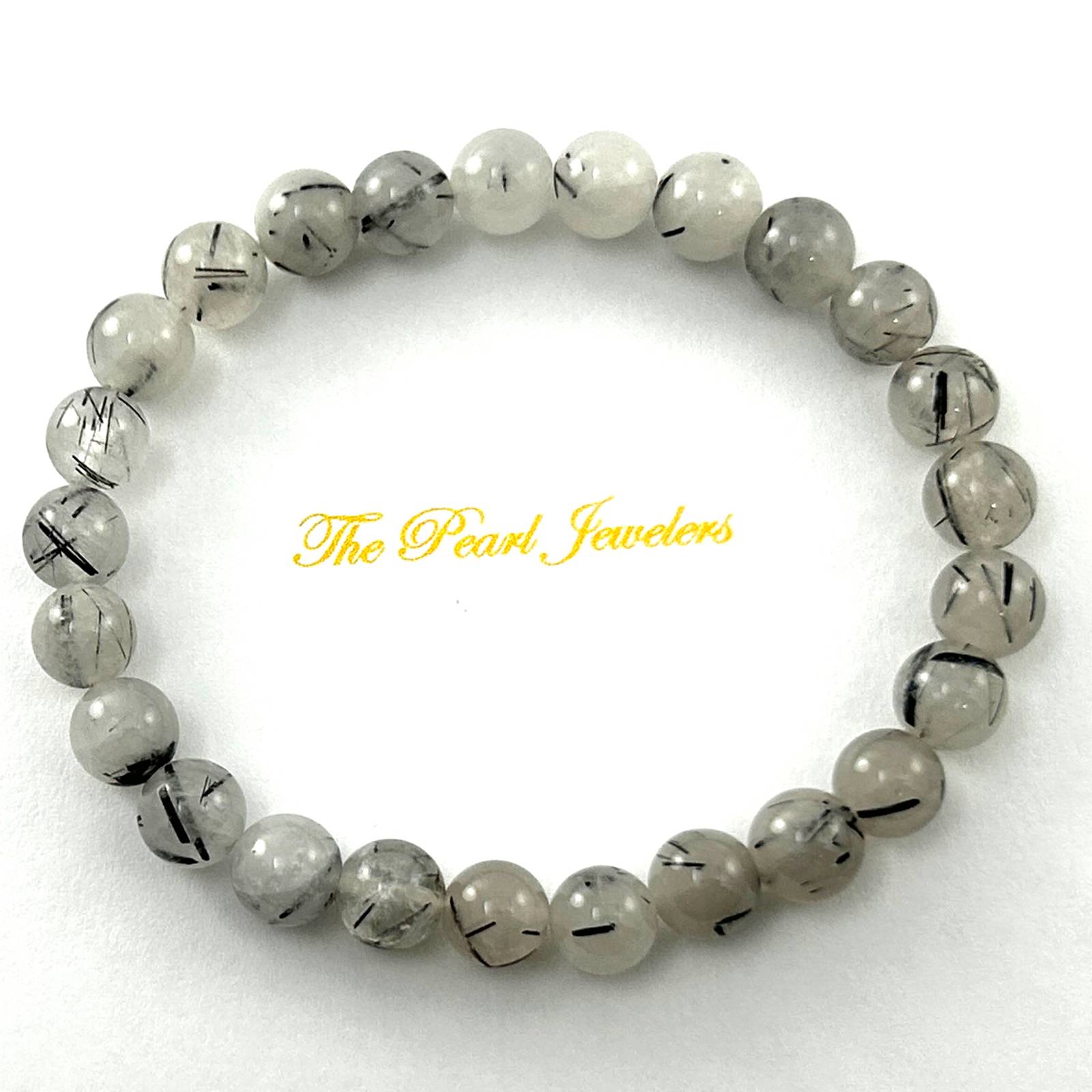 This bracelet features 7.5mm black rutilated quartz beads, a light and flexible choice for spiritual protection and clarity.
