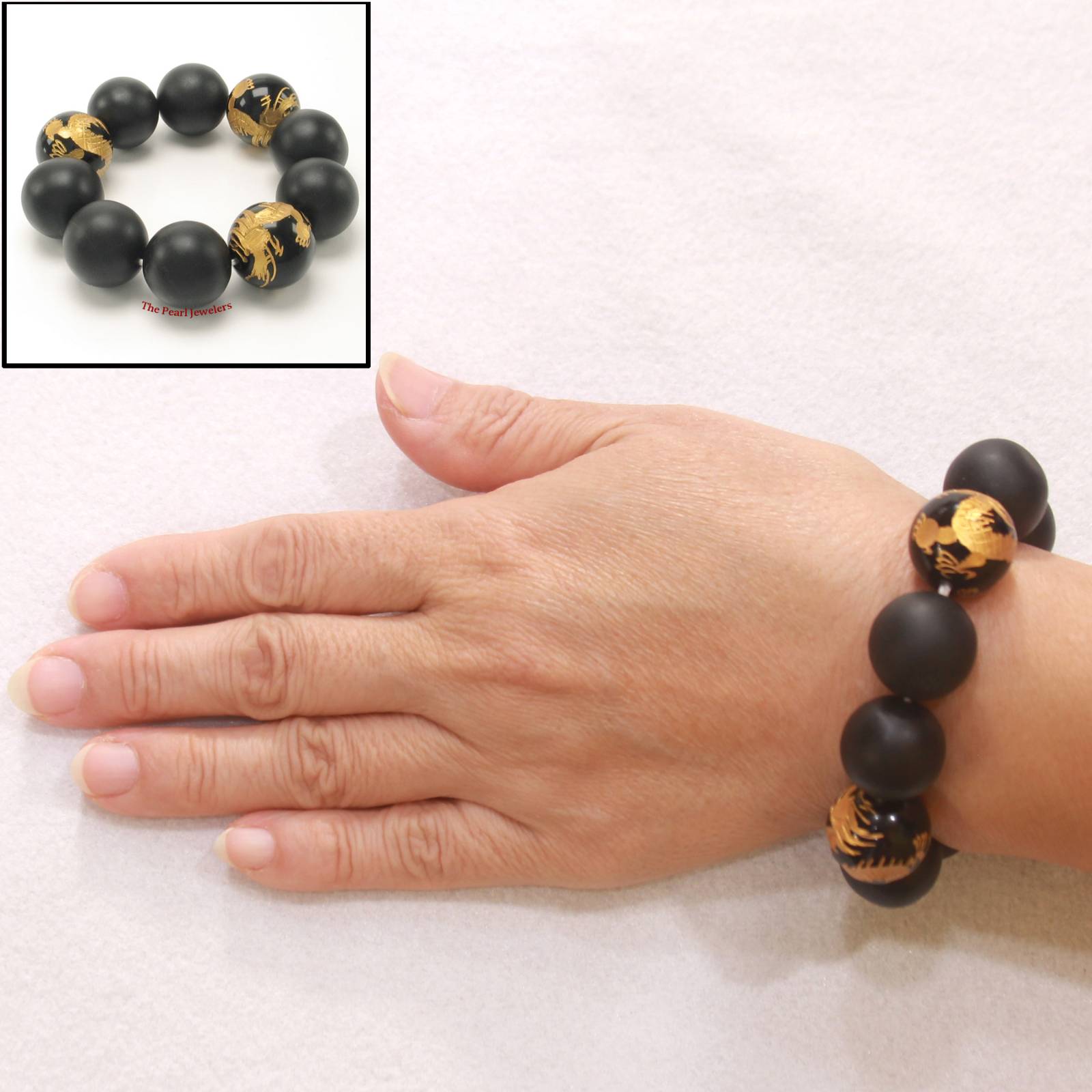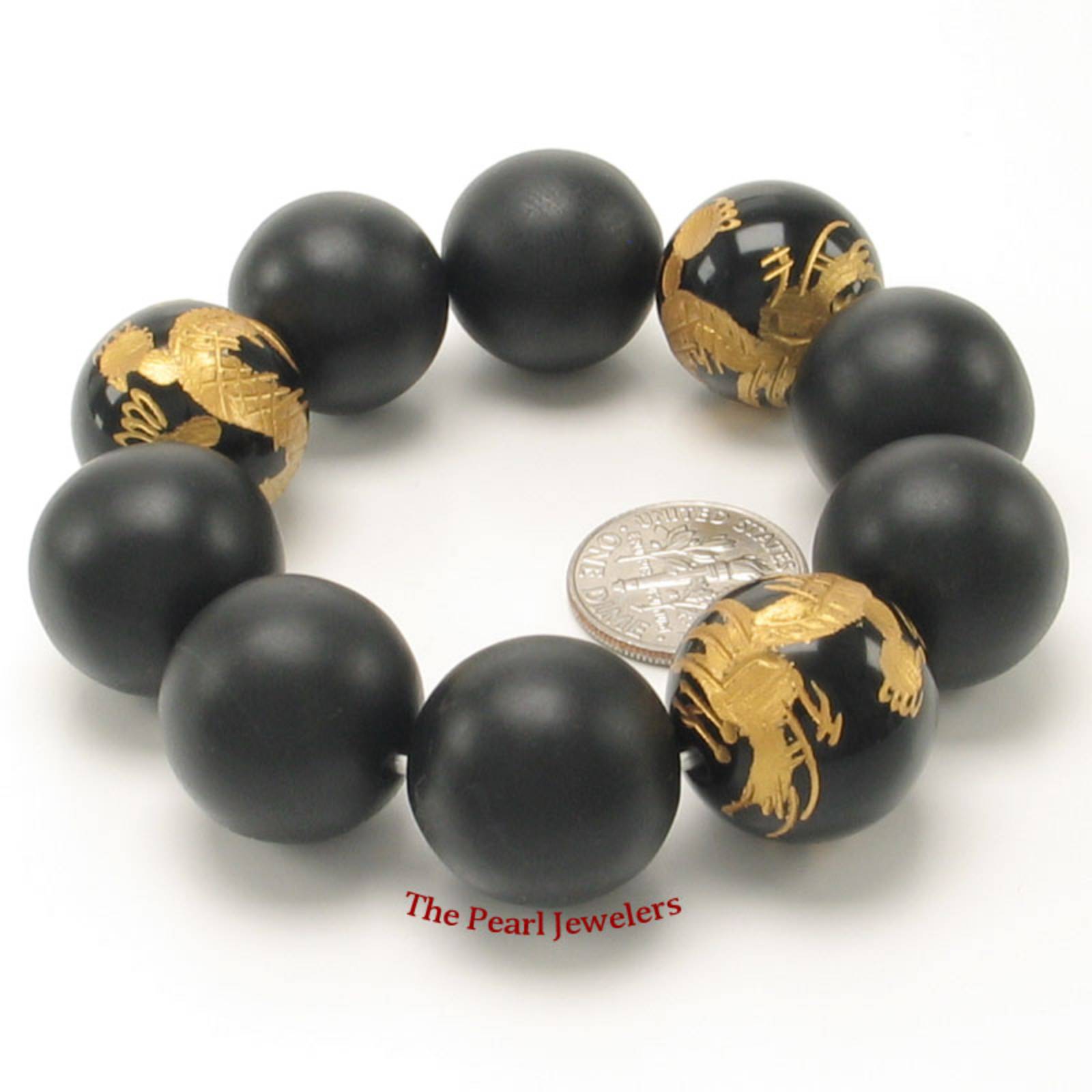 This bold 18mm handcrafted bracelet features seven Bian stones and three black onyx dragon beads, promoting confidence and transformation.