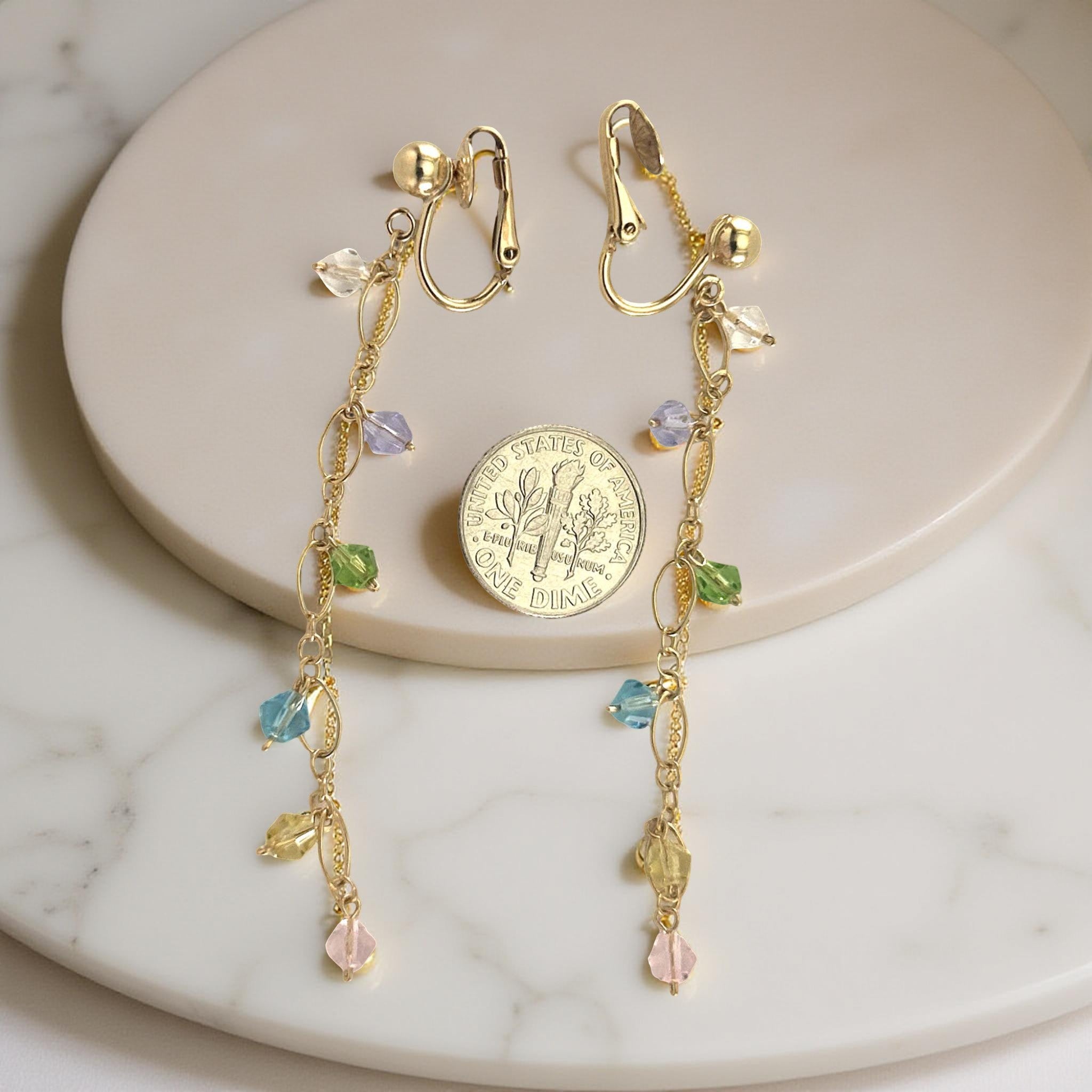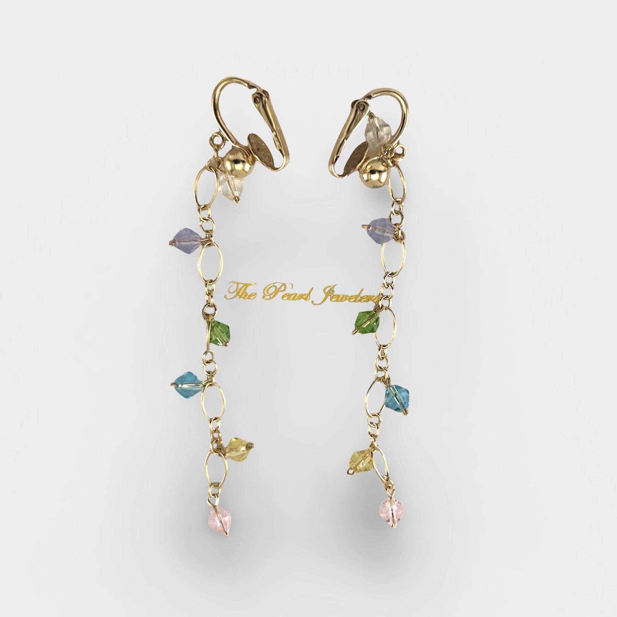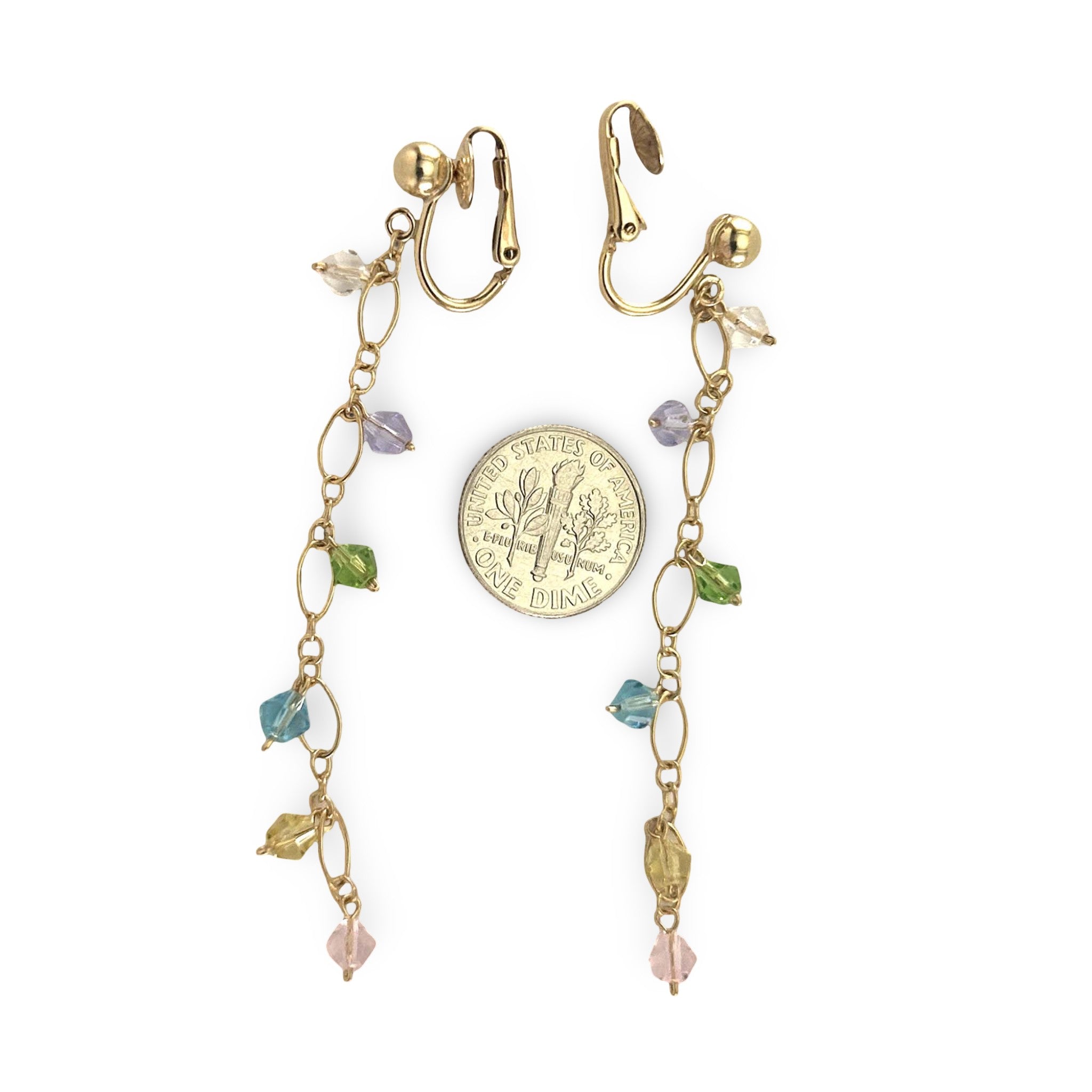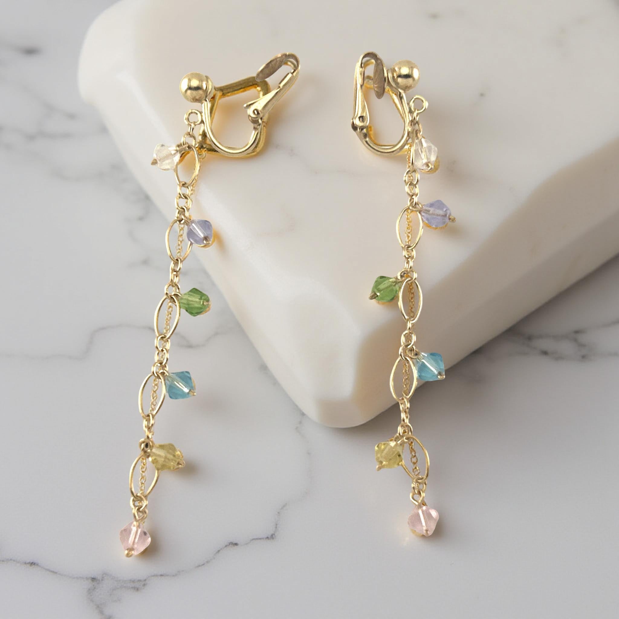 Handcrafted rainbow glass bead earrings in a 14K gold-filled non-pierced clip-on design, vibrant and elegant, designed for comfort and dependable daily wear.