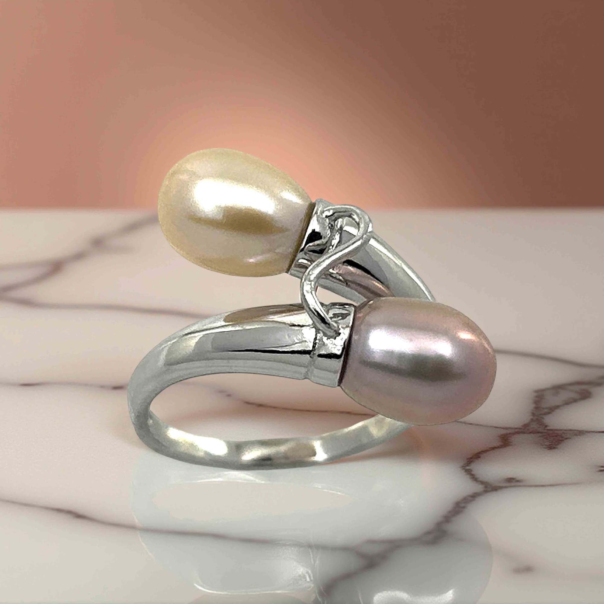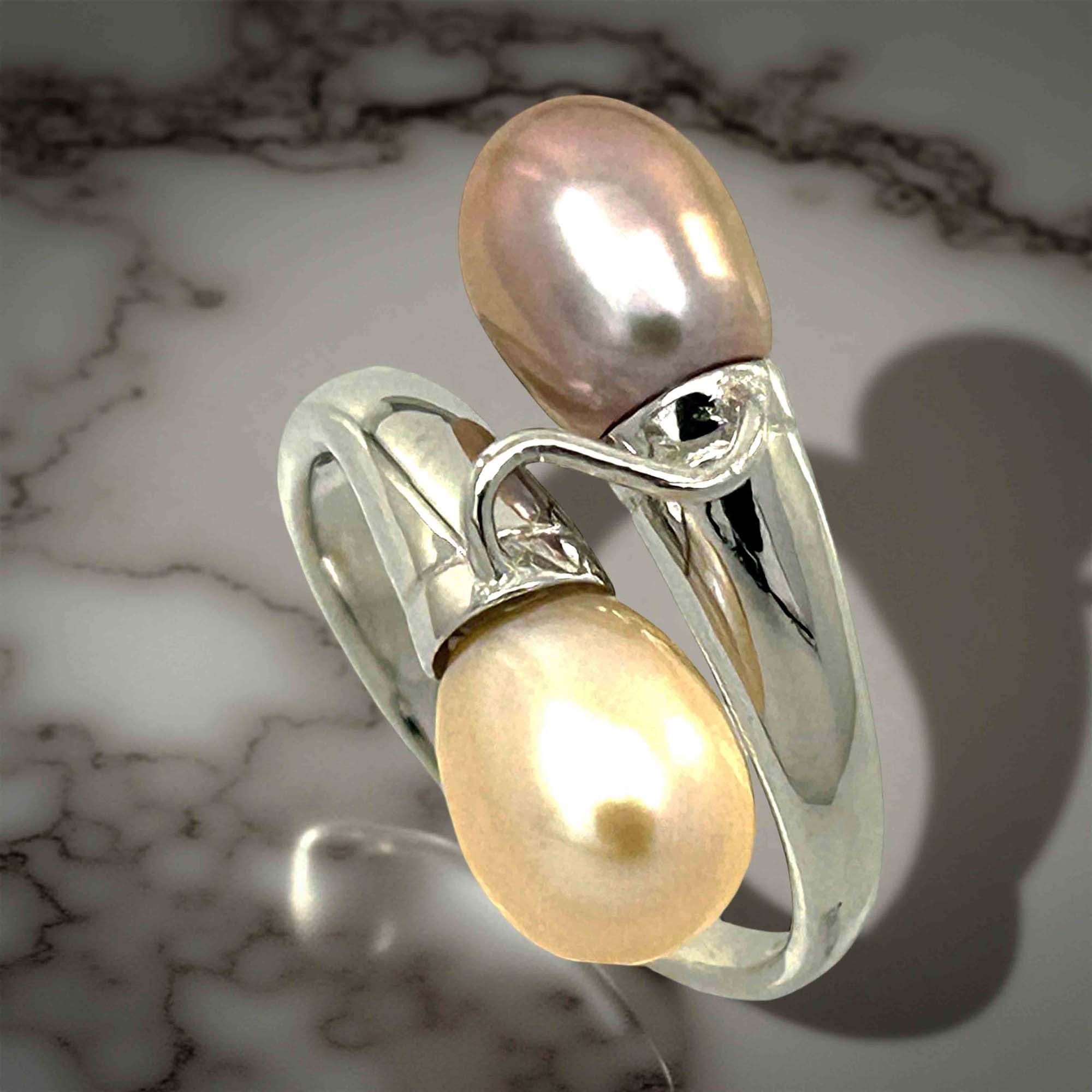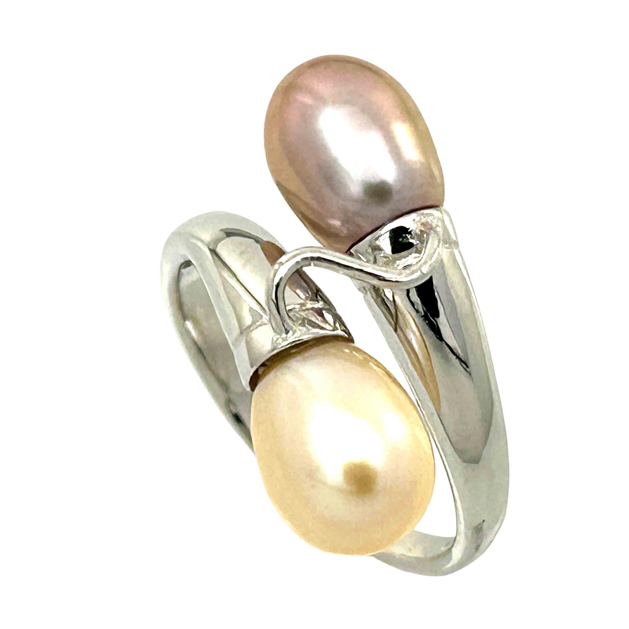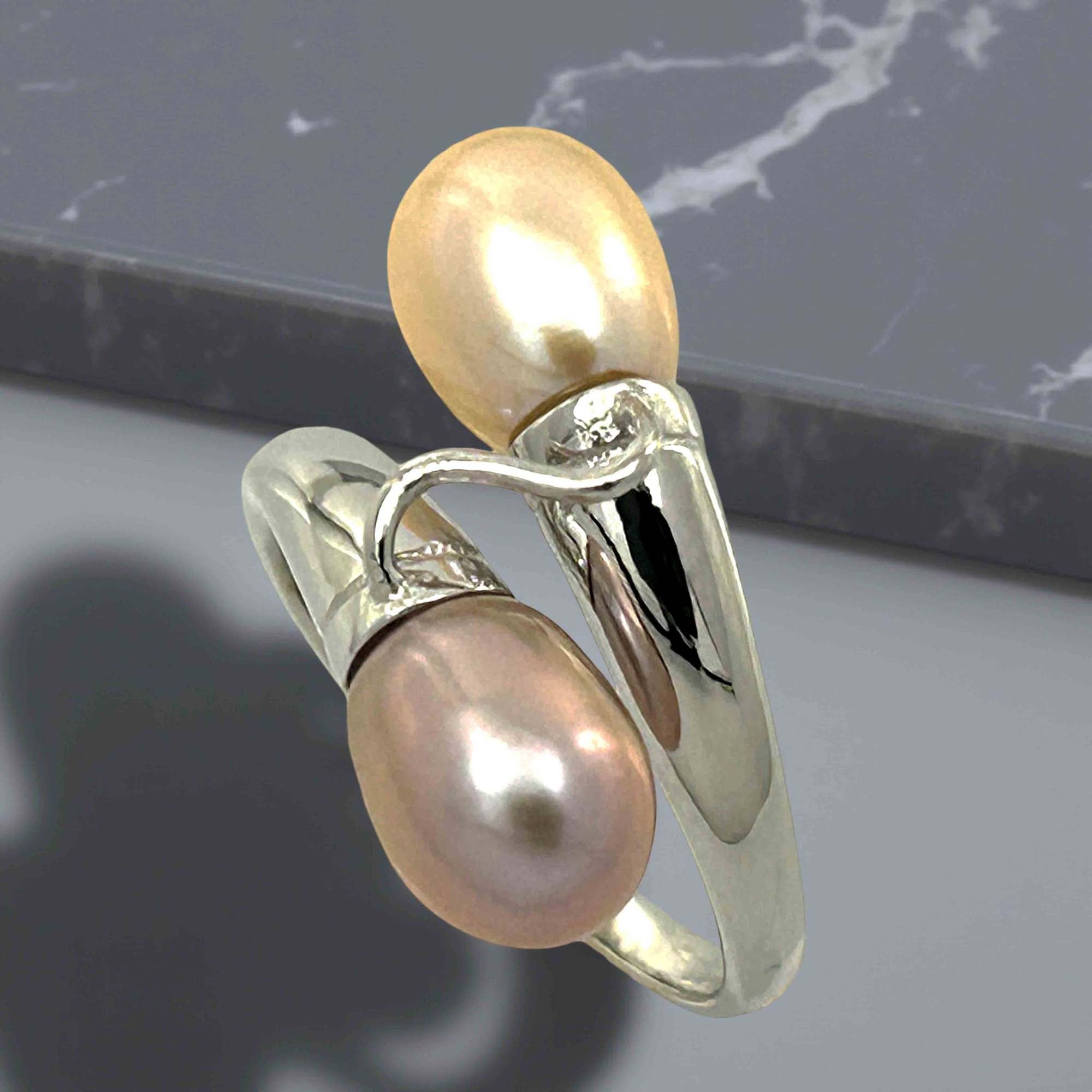 🍑 Two genuine freshwater pearls—one peach, one pink (≈6.5–7.5 mm each)—curve in a handcrafted sterling-silver bypass setting.