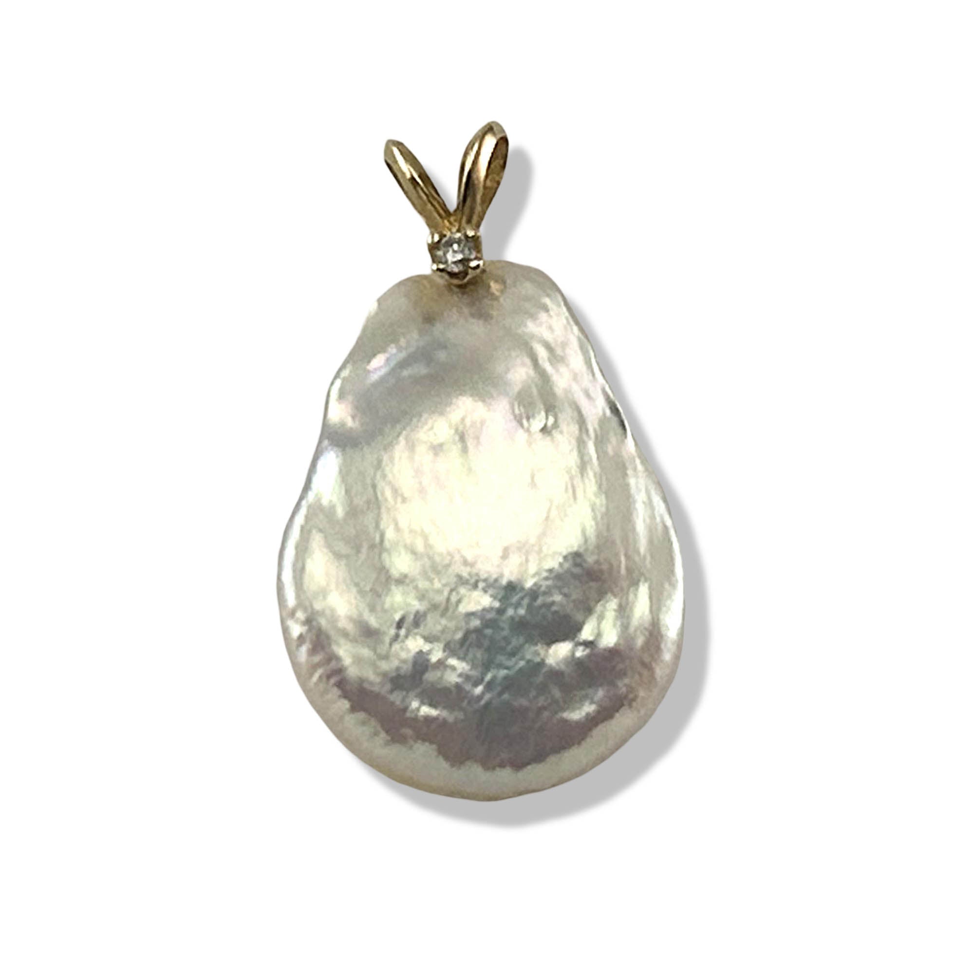 A luminous 19mm white baroque coin pearl set in a unique 14k yellow gold rabbit-ear bail with sparkling diamond. Artistic and bold, designed for comfort and dependable daily wear.