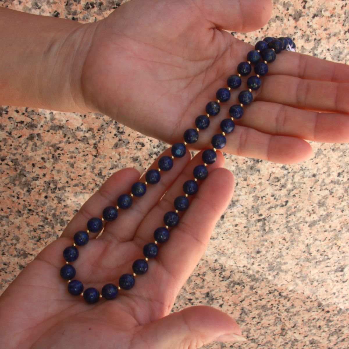 **8mm Lapis Lazuli & 14k Gold Beads Necklace with Filigree Clasp**