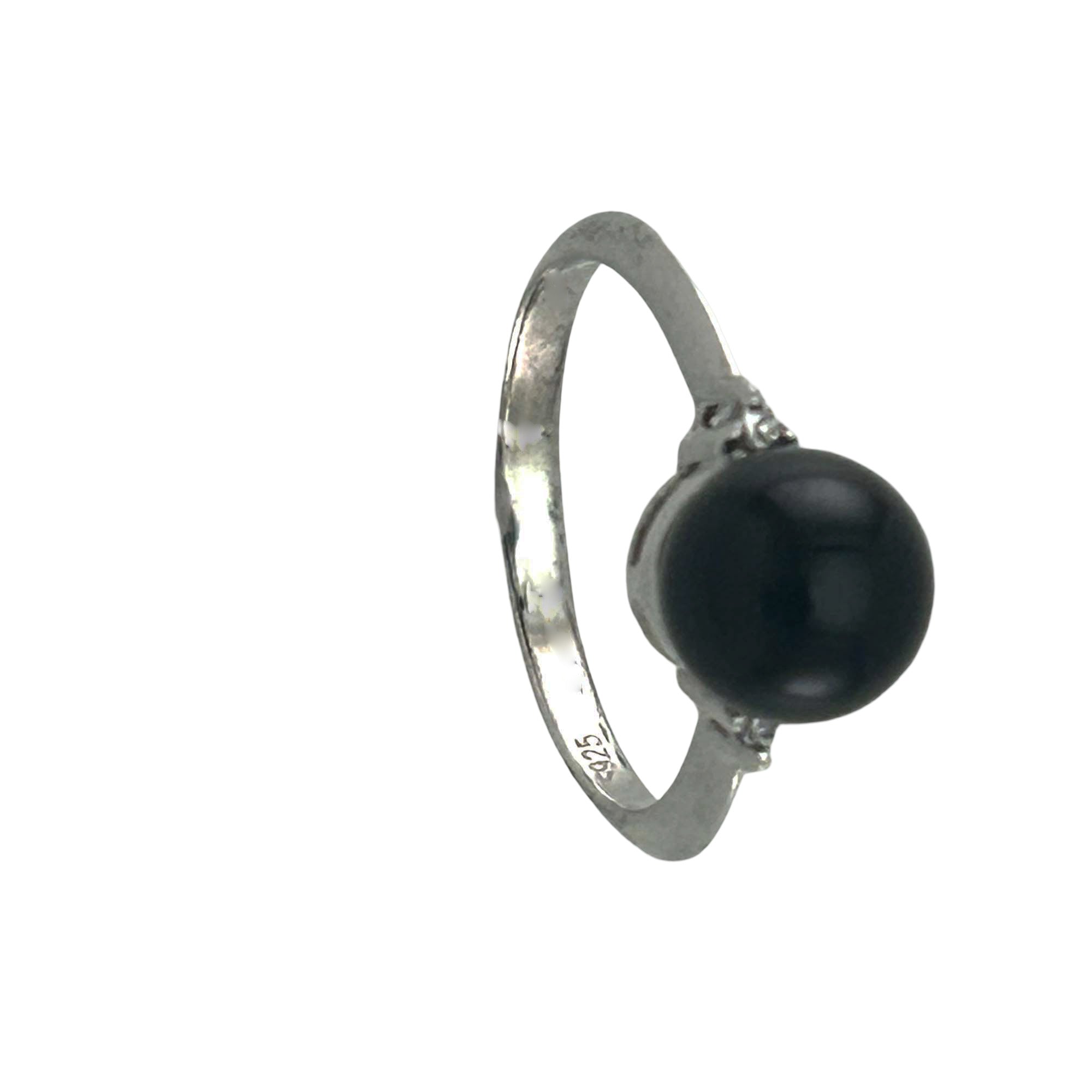 A sterling silver solitaire ring featuring a 7.5–8mm round black onyx, accented by two cubic zirconia stones, rhodium plated for shine, designed for comfort and dependable daily wear.